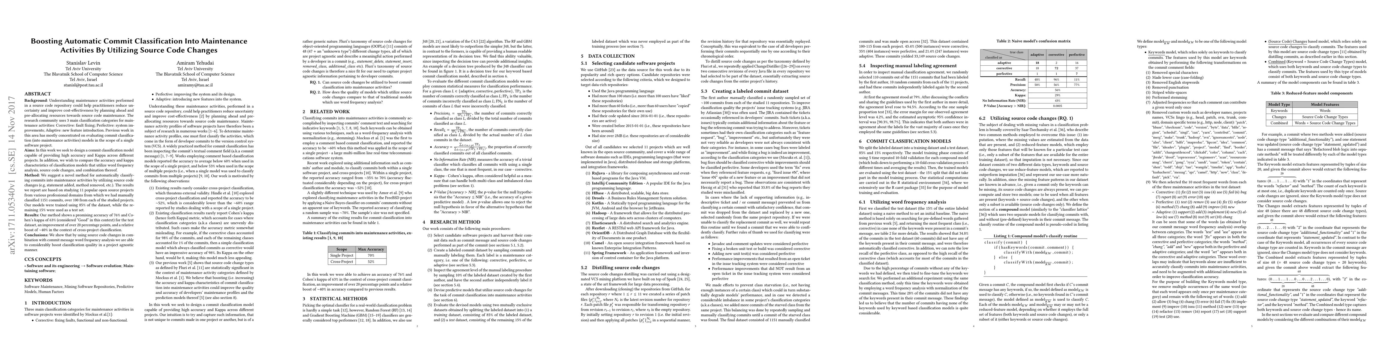 This paper proposes a novel method for classifying software commits into maintenance activities using source code changes, achieving an accuracy of 76% and a Cohen's kappa of 63% across 11 diverse open-source projects. The method outperforms single-project models by improving cross-project classification accuracy by over 20 percentage points.