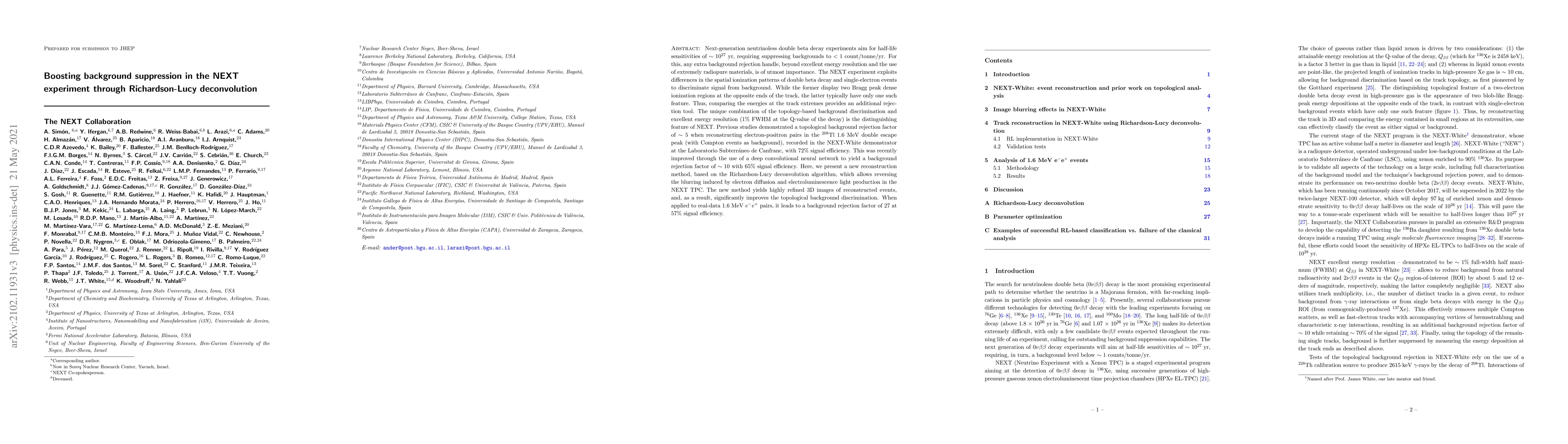 A new reconstruction method using Richardson-Lucy deconvolution improves background discrimination in the NEXT experiment, yielding a 27-fold rejection factor at 57% signal efficiency.