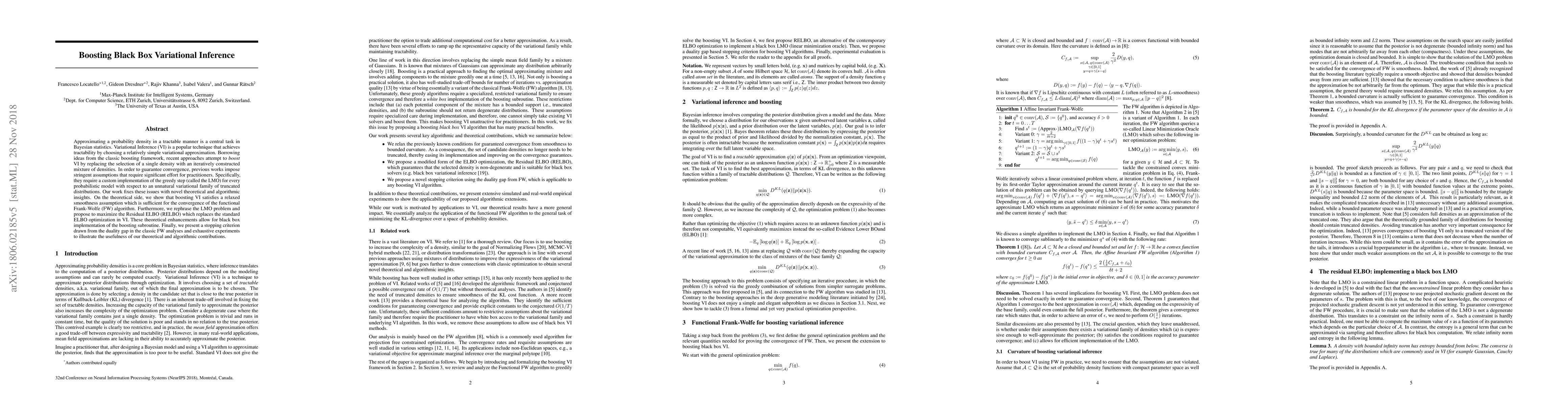 Approximating a probability density in a tractable manner is a central task in Bayesian statistics. Variational Inference (VI) is a popular technique that achieves tractability by choosing a relatively simple variational family. Borrowing ideas from the classic boosting framework, recent approaches attempt to \emph{boost} VI by replacing the selection of a single density with a greedily constructed mixture of densities. In order to guarantee convergence, previous works impose stringent assumptions that require significant effort for practitioners. Specifically, they require a custom implementation of the greedy step (called the LMO) for every probabilistic model with respect to an unnatural variational family of truncated distributions. Our work fixes these issues with novel theoretical and algorithmic insights. On the theoretical side, we show that boosting VI satisfies a relaxed smoothness assumption which is sufficient for the convergence of the functional Frank-Wolfe (FW) algorithm. Furthermore, we rephrase the LMO problem and propose to maximize the Residual ELBO (RELBO) which replaces the standard ELBO optimization in VI. These theoretical enhancements allow for black box implementation of the boosting subroutine. Finally, we present a stopping criterion drawn from the duality gap in the classic FW analyses and exhaustive experiments to illustrate the usefulness of our theoretical and algorithmic contributions.