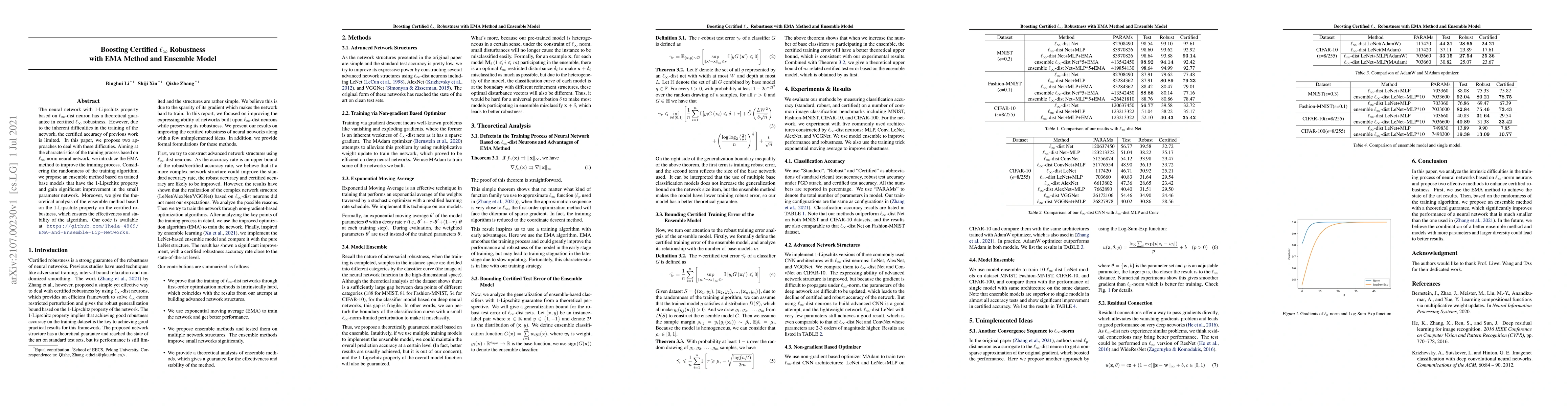 This paper proposes two methods to improve certified $oldsymbol{ ext{l}}_ ext{\infty}$ robustness in neural networks: the Exponential Moving Average (EMA) method for training and an ensemble approach using trained models with $1$-Lipschitz property.