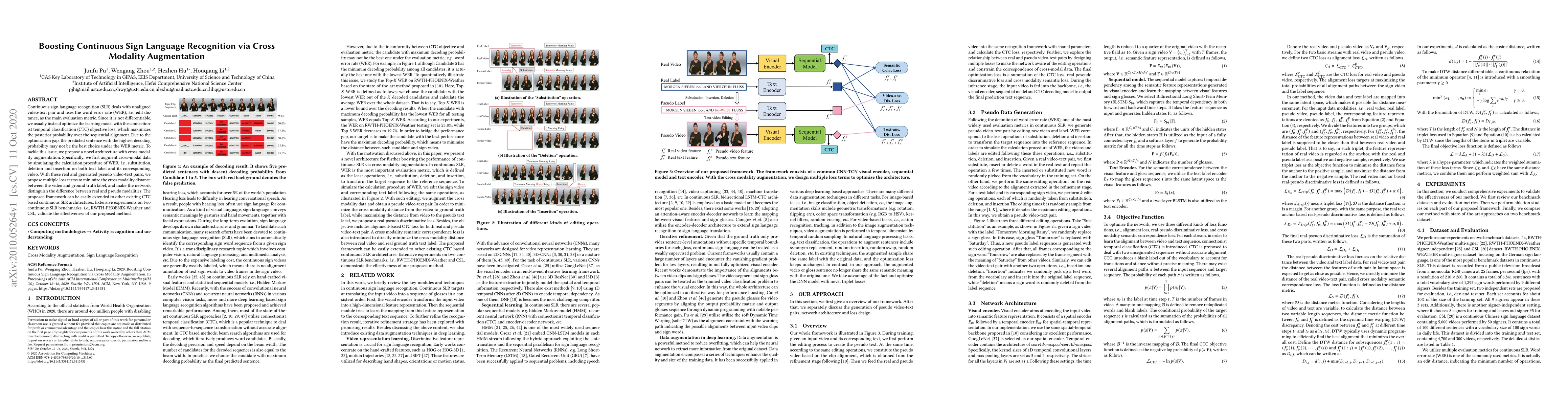 Continuous sign language recognition (SLR) deals with unaligned video-text pair and uses the word error rate (WER), i.e., edit distance, as the main evaluation metric. Since it is not differentiable, we usually instead optimize the learning model with the connectionist temporal classification (CTC) objective loss, which maximizes the posterior probability over the sequential alignment. Due to the optimization gap, the predicted sentence with the highest decoding probability may not be the best choice under the WER metric. To tackle this issue, we propose a novel architecture with cross modality augmentation. Specifically, we first augment cross-modal data by simulating the calculation procedure of WER, i.e., substitution, deletion and insertion on both text label and its corresponding video. With these real and generated pseudo video-text pairs, we propose multiple loss terms to minimize the cross modality distance between the video and ground truth label, and make the network distinguish the difference between real and pseudo modalities. The proposed framework can be easily extended to other existing CTC based continuous SLR architectures. Extensive experiments on two continuous SLR benchmarks, i.e., RWTH-PHOENIX-Weather and CSL, validate the effectiveness of our proposed method.