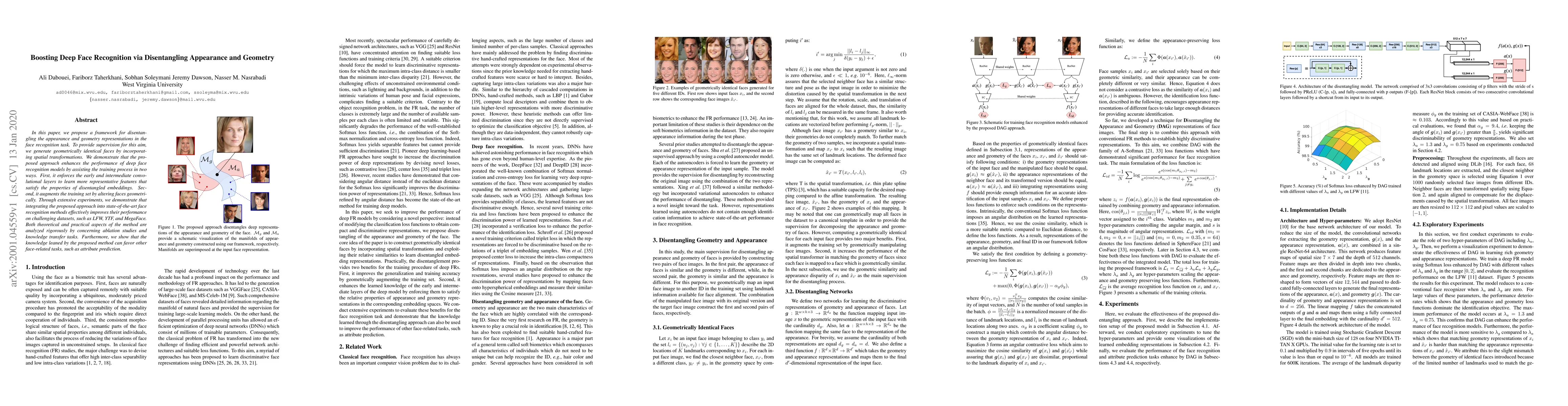 In this paper, we propose a framework for disentangling the appearance and geometry representations in the face recognition task. To provide supervision for this aim, we generate geometrically identical faces by incorporating spatial transformations. We demonstrate that the proposed approach enhances the performance of deep face recognition models by assisting the training process in two ways. First, it enforces the early and intermediate convolutional layers to learn more representative features that satisfy the properties of disentangled embeddings. Second, it augments the training set by altering faces geometrically. Through extensive experiments, we demonstrate that integrating the proposed approach into state-of-the-art face recognition methods effectively improves their performance on challenging datasets, such as LFW, YTF, and MegaFace. Both theoretical and practical aspects of the method are analyzed rigorously by concerning ablation studies and knowledge transfer tasks. Furthermore, we show that the knowledge leaned by the proposed method can favor other face-related tasks, such as attribute prediction.