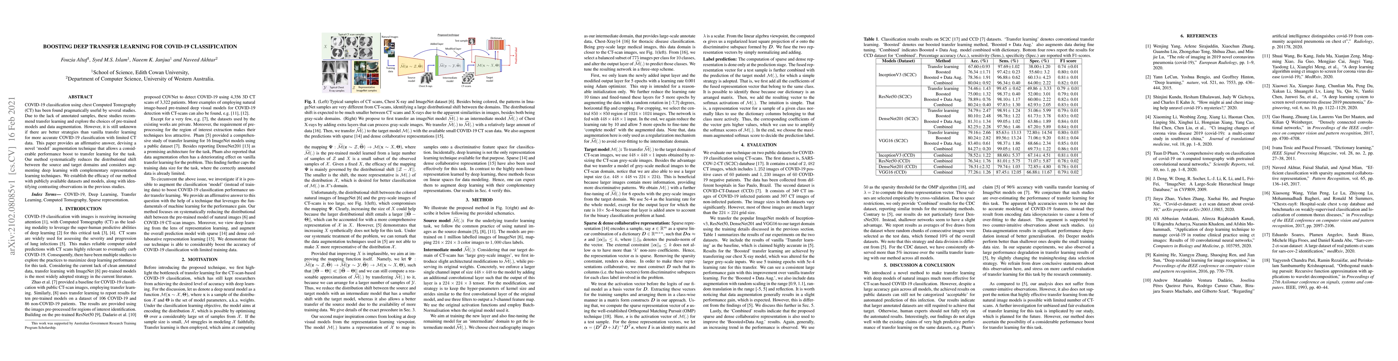 The paper proposes a novel method for enhancing deep transfer learning in COVID-19 classification using CT scans. It involves a two-step transfer from ImageNet models to Chest X-ray models and then to the target CT-scan domain, alongside incorporating sparse and dense collaborative representations.