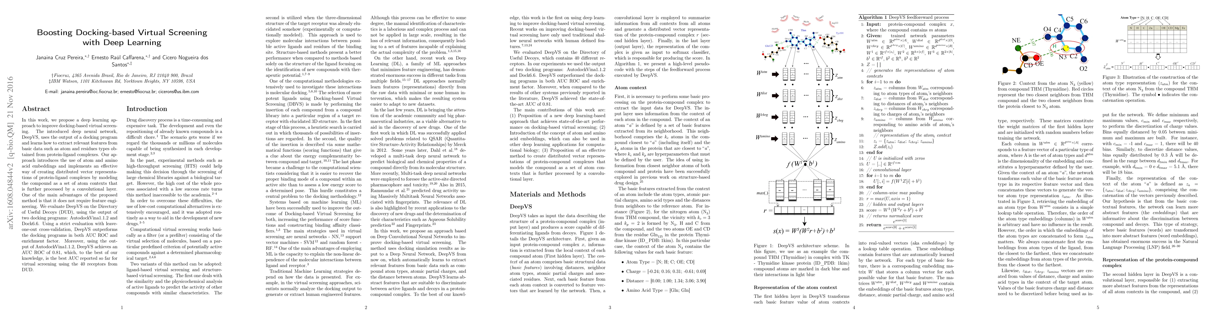 This paper proposes DeepVS, a deep learning method to enhance docking-based virtual screening by learning features directly from protein-ligand complex data without requiring feature engineering. DeepVS outperforms traditional docking programs in AUC ROC and enrichment factor, achieving the best reported AUC ROC of 0.81 using AutodockVina1.1.2 outputs.
