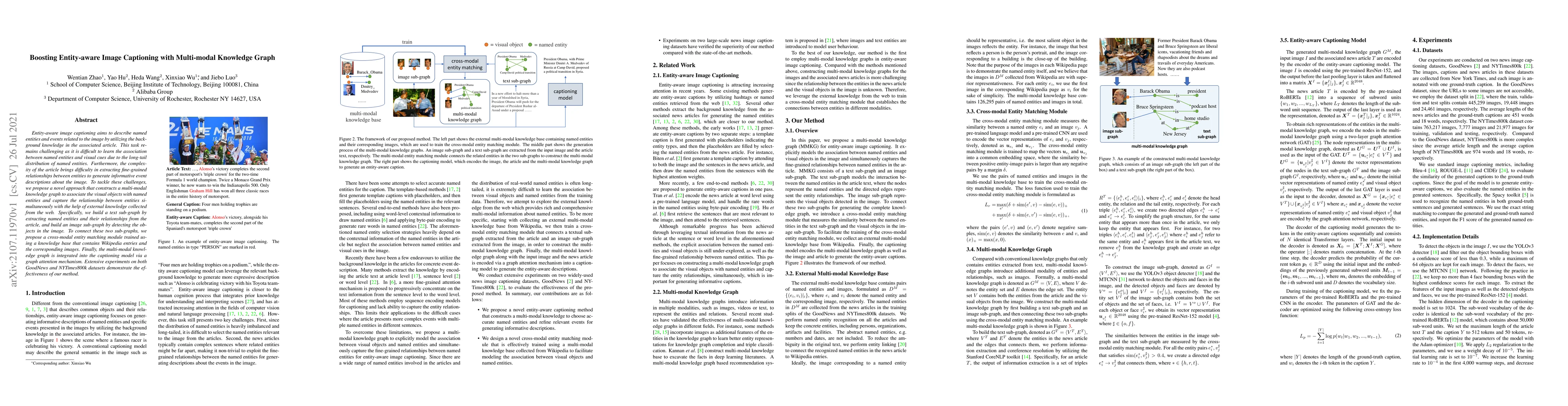 This paper proposes a method to enhance entity-aware image captioning by constructing a multi-modal knowledge graph that connects visual objects with named entities and their relationships, using a cross-modal entity matching module trained on Wikipedia and image data. Experiments show improved performance on datasets like GoodNews and NYTimes800k.