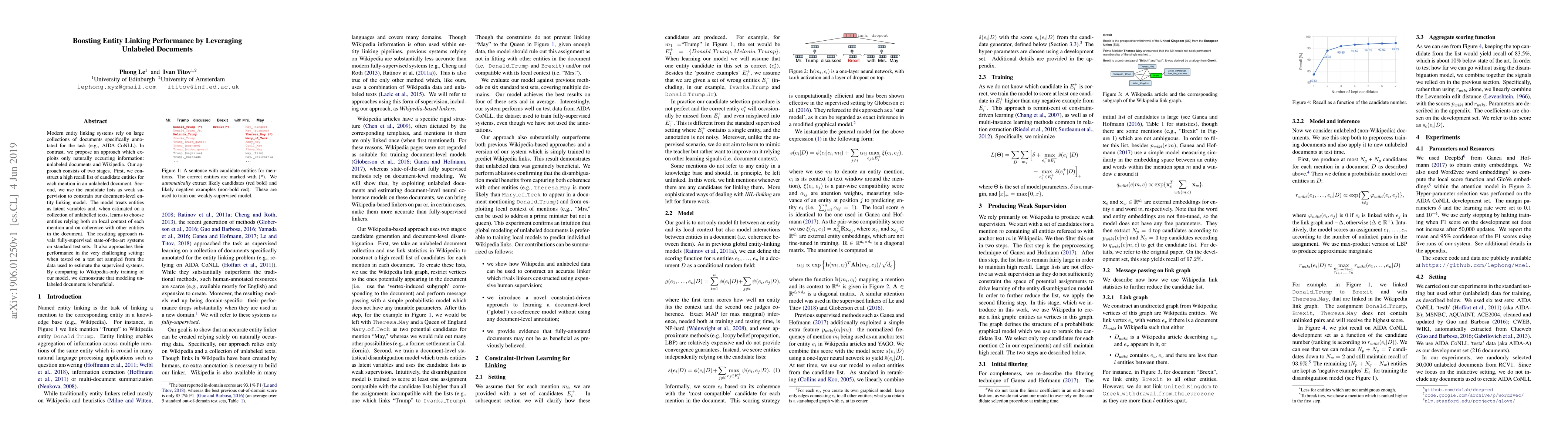 This paper proposes an entity linking method that leverages unlabeled documents and Wikipedia to improve performance, achieving competitive results against fully supervised systems. The approach uses unlabeled text to generate a high recall list of entity candidates and then trains a model to select entities based on local context and document coherence.