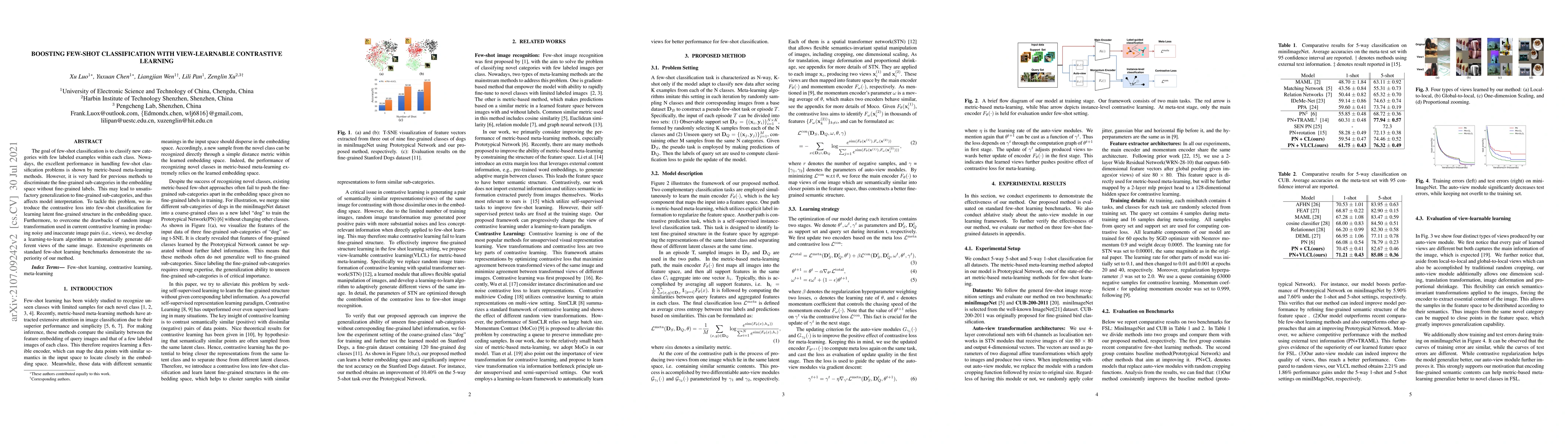 The goal of few-shot classification is to classify new categories with few labeled examples within each class. Nowadays, the excellent performance in handling few-shot classification problems is shown by metric-based meta-learning methods. However, it is very hard for previous methods to discriminate the fine-grained sub-categories in the embedding space without fine-grained labels. This may lead to unsatisfactory generalization to fine-grained subcategories, and thus affects model interpretation. To tackle this problem, we introduce the contrastive loss into few-shot classification for learning latent fine-grained structure in the embedding space. Furthermore, to overcome the drawbacks of random image transformation used in current contrastive learning in producing noisy and inaccurate image pairs (i.e., views), we develop a learning-to-learn algorithm to automatically generate different views of the same image. Extensive experiments on standard few-shot learning benchmarks demonstrate the superiority of our method.