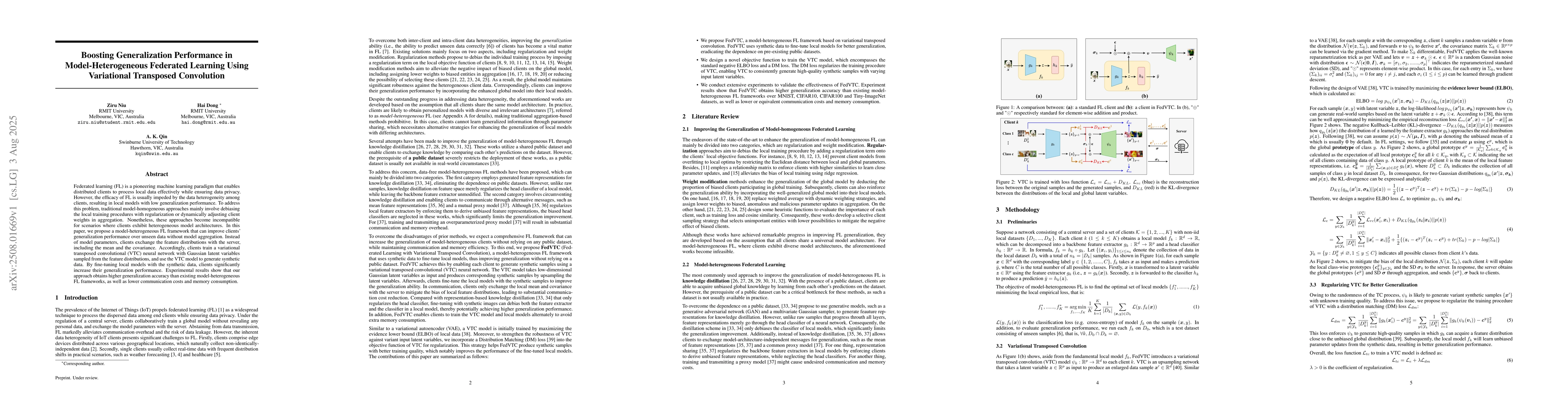 Federated learning (FL) is a pioneering machine learning paradigm that enables distributed clients to process local data effectively while ensuring data privacy. However, the efficacy of FL is usually impeded by the data heterogeneity among clients, resulting in local models with low generalization performance. To address this problem, traditional model-homogeneous approaches mainly involve debiasing the local training procedures with regularization or dynamically adjusting client weights in aggregation. Nonetheless, these approaches become incompatible for scenarios where clients exhibit heterogeneous model architectures. In this paper, we propose a model-heterogeneous FL framework that can improve clients' generalization performance over unseen data without model aggregation. Instead of model parameters, clients exchange the feature distributions with the server, including the mean and the covariance. Accordingly, clients train a variational transposed convolutional (VTC) neural network with Gaussian latent variables sampled from the feature distributions, and use the VTC model to generate synthetic data. By fine-tuning local models with the synthetic data, clients significantly increase their generalization performance. Experimental results show that our approach obtains higher generalization accuracy than existing model-heterogeneous FL frameworks, as well as lower communication costs and memory consumption