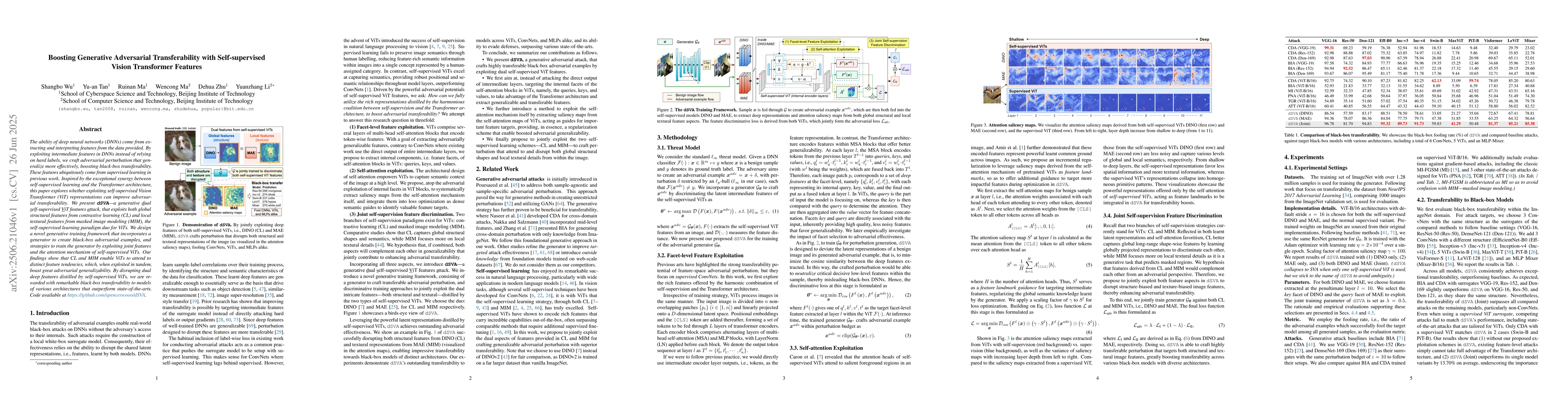 The paper introduces dSVA, a generative adversarial attack that exploits self-supervised Vision Transformer features by disrupting both global structural and local textural representations using joint feature strategies and attention mechanisms.