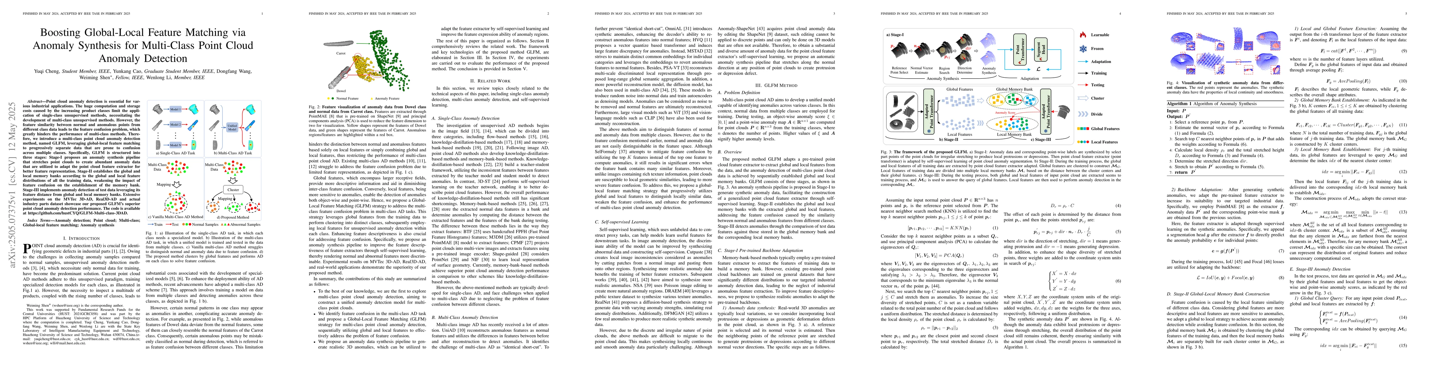 The research introduces GLFM, a multi-class point cloud anomaly detection method that employs global-local feature matching to progressively separate data prone to confusion across multiple classes. It consists of three stages: anomaly synthesis for feature extractor adaptation, establishment of global and local memory banks based on feature distributions, and anomaly detection using feature distance from memory banks.