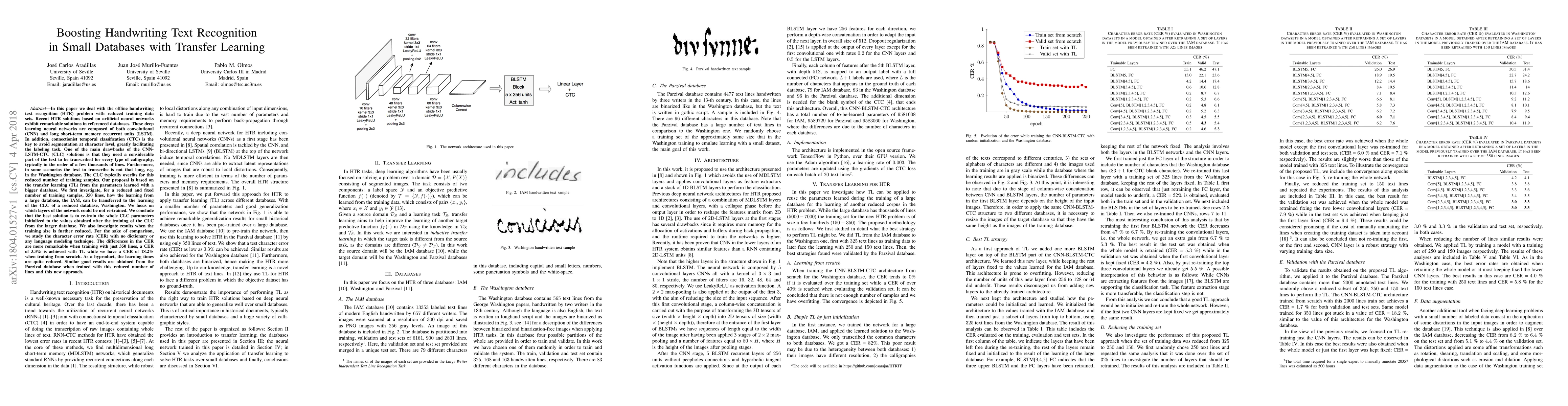 In this paper we deal with the offline handwriting text recognition (HTR) problem with reduced training datasets. Recent HTR solutions based on artificial neural networks exhibit remarkable solutions in referenced databases. These deep learning neural networks are composed of both convolutional (CNN) and long short-term memory recurrent units (LSTM). In addition, connectionist temporal classification (CTC) is the key to avoid segmentation at character level, greatly facilitating the labeling task. One of the main drawbacks of the CNNLSTM-CTC (CLC) solutions is that they need a considerable part of the text to be transcribed for every type of calligraphy, typically in the order of a few thousands of lines. Furthermore, in some scenarios the text to transcribe is not that long, e.g. in the Washington database. The CLC typically overfits for this reduced number of training samples. Our proposal is based on the transfer learning (TL) from the parameters learned with a bigger database. We first investigate, for a reduced and fixed number of training samples, 350 lines, how the learning from a large database, the IAM, can be transferred to the learning of the CLC of a reduced database, Washington. We focus on which layers of the network could be not re-trained. We conclude that the best solution is to re-train the whole CLC parameters initialized to the values obtained after the training of the CLC from the larger database. We also investigate results when the training size is further reduced. The differences in the CER are more remarkable when training with just 350 lines, a CER of 3.3% is achieved with TL while we have a CER of 18.2% when training from scratch. As a byproduct, the learning times are quite reduced. Similar good results are obtained from the Parzival database when trained with this reduced number of lines and this new approach.