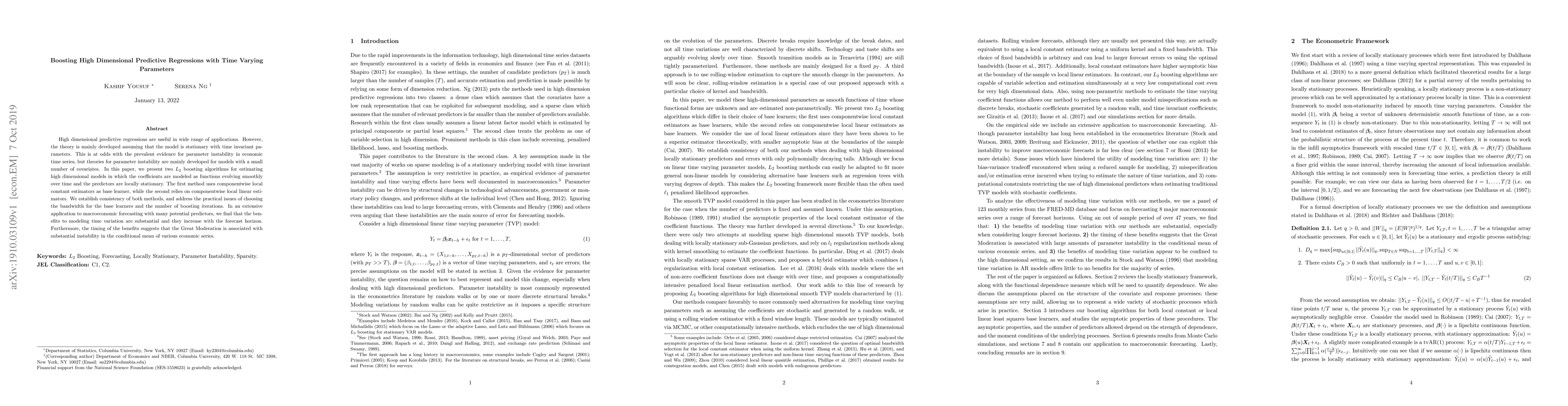 High dimensional predictive regressions are useful in wide range of applications. However, the theory is mainly developed assuming that the model is stationary with time invariant parameters. This is at odds with the prevalent evidence for parameter instability in economic time series, but theories for parameter instability are mainly developed for models with a small number of covariates. In this paper, we present two $L_2$ boosting algorithms for estimating high dimensional models in which the coefficients are modeled as functions evolving smoothly over time and the predictors are locally stationary. The first method uses componentwise local constant estimators as base learner, while the second relies on componentwise local linear estimators. We establish consistency of both methods, and address the practical issues of choosing the bandwidth for the base learners and the number of boosting iterations. In an extensive application to macroeconomic forecasting with many potential predictors, we find that the benefits to modeling time variation are substantial and they increase with the forecast horizon. Furthermore, the timing of the benefits suggests that the Great Moderation is associated with substantial instability in the conditional mean of various economic series.