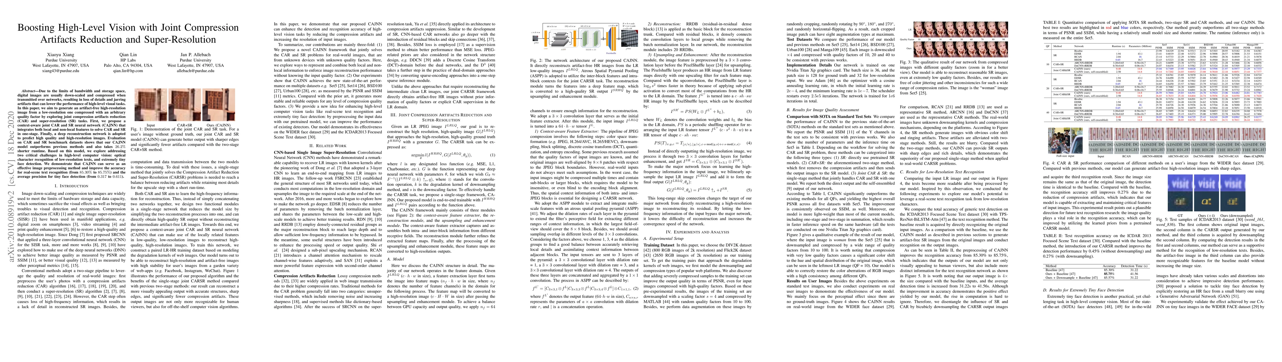This paper proposes a context-aware joint compression artifacts reduction and super-resolution neural network (CAJNN) to generate high-quality, high-resolution images from compressed low-resolution inputs. The CAJNN model outperforms previous methods and significantly reduces runtime, enhancing applications like text recognition and tiny face detection.