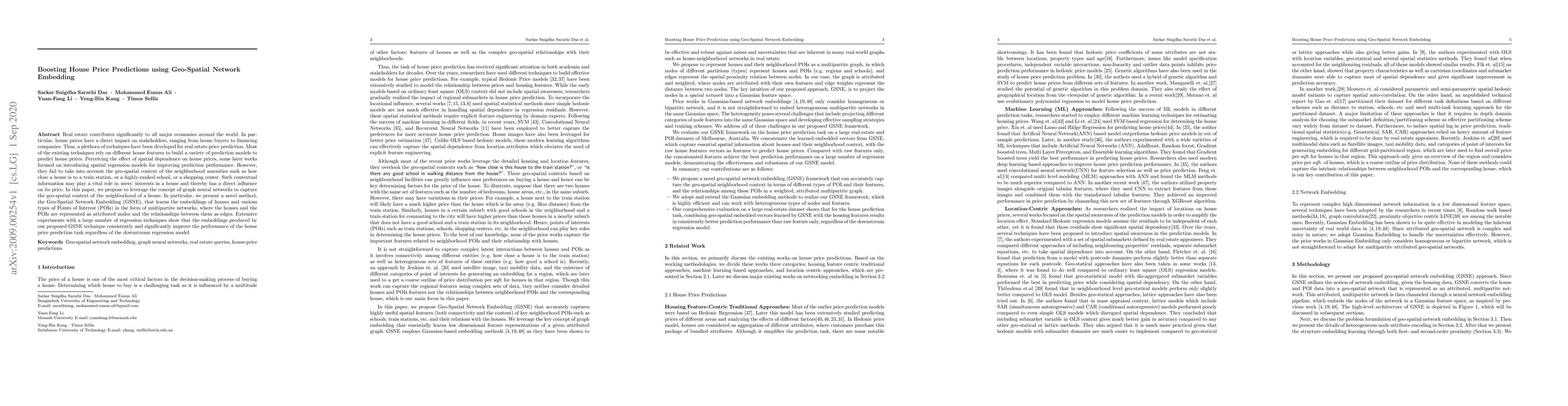 Real estate contributes significantly to all major economies around the world. In particular, house prices have a direct impact on stakeholders, ranging from house buyers to financing companies. Thus, a plethora of techniques have been developed for real estate price prediction. Most of the existing techniques rely on different house features to build a variety of prediction models to predict house prices. Perceiving the effect of spatial dependence on house prices, some later works focused on introducing spatial regression models for improving prediction performance. However, they fail to take into account the geo-spatial context of the neighborhood amenities such as how close a house is to a train station, or a highly-ranked school, or a shopping center. Such contextual information may play a vital role in users' interests in a house and thereby has a direct influence on its price. In this paper, we propose to leverage the concept of graph neural networks to capture the geo-spatial context of the neighborhood of a house. In particular, we present a novel method, the Geo-Spatial Network Embedding (GSNE), that learns the embeddings of houses and various types of Points of Interest (POIs) in the form of multipartite networks, where the houses and the POIs are represented as attributed nodes and the relationships between them as edges. Extensive experiments with a large number of regression techniques show that the embeddings produced by our proposed GSNE technique consistently and significantly improve the performance of the house price prediction task regardless of the downstream regression model.