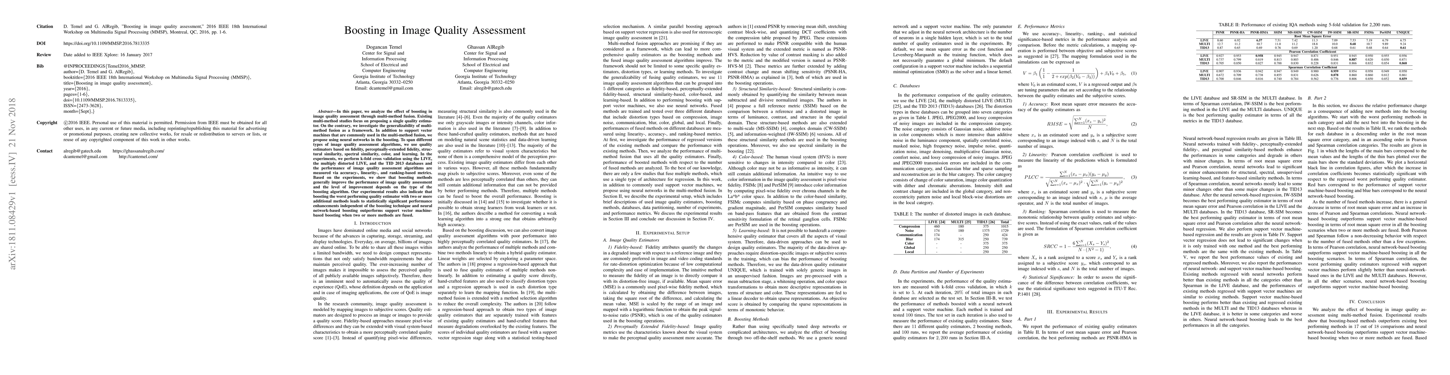 This paper investigates the effectiveness of boosting through multi-method fusion for image quality assessment, demonstrating that boosting generally improves performance. Neural network-based boosting shows superior results compared to support vector machine-based boosting, especially when combining multiple quality estimators.