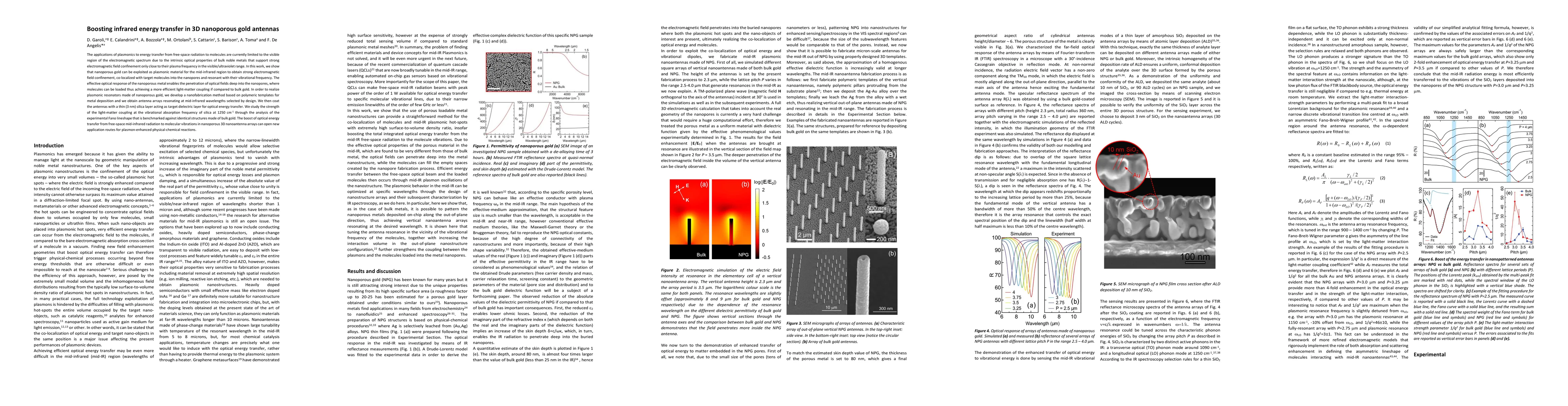 This paper demonstrates that nanoporous gold can serve as an effective plasmonic material for mid-infrared energy transfer, achieving enhanced light-matter coupling compared to bulk gold. The researchers developed a nanofabrication method to create 3D nanoantenna arrays that exhibit strong electromagnetic field confinement and improved energy transfer efficiency at mid-infrared wavelengths.