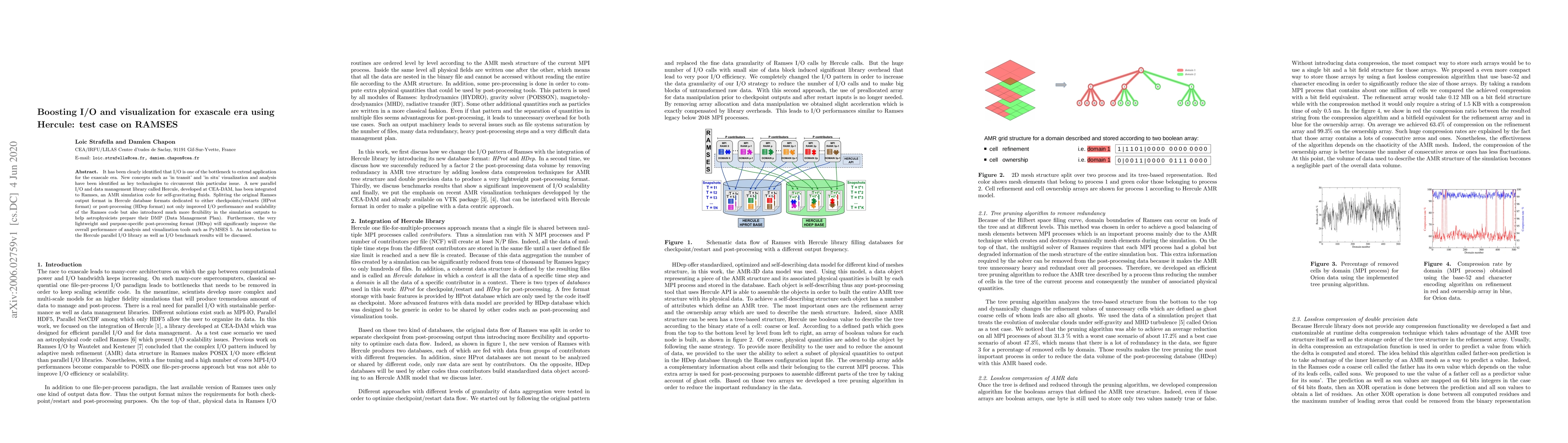 It has been clearly identified that I/O is one of the bottleneck to extend application for the exascale era. New concepts such as 'in transit' and 'in situ' visualization and analysis have been identified as key technologies to circumvent this particular issue. A new parallel I/O and data management library called Hercule, developed at CEA-DAM, has been integrated to Ramses, an AMR simulation code for self-gravitating fluids. Splitting the original Ramses output format in Hercule database formats dedicated to either checkpoints/restarts (HProt format) or post-processing (HDep format) not only improved I/O performance and scalability of the Ramses code but also introduced much more flexibility in the simulation outputs to help astrophysicists prepare their DMP (Data Management Plan). Furthermore, the very lightweight and purpose-specific post-processing format (HDep) will significantly improve the overall performance of analysis and visualization tools such as PyMSES 5. An introduction to the Hercule parallel I/O library as well as I/O benchmark results will be discussed.