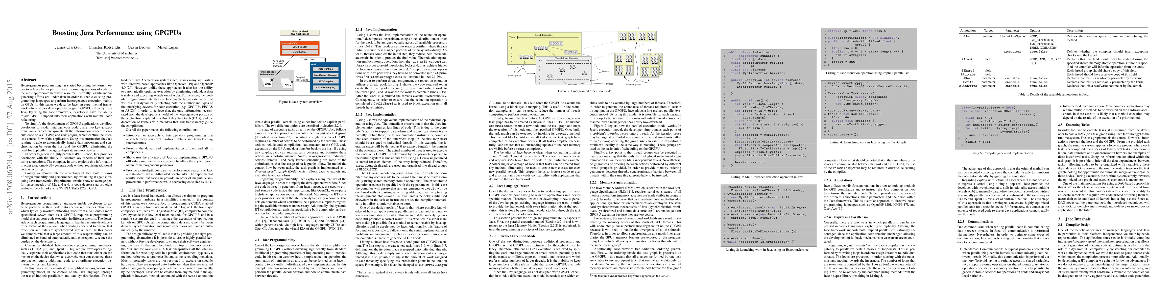 This paper introduces Jacc, a framework enabling Java developers to directly program GPGPUs with minimal code changes, using abstractions like tasks and task graphs for automatic data management and synchronization. Experimental results show a 32x performance improvement and a 4.4x reduction in code complexity compared to existing Java frameworks.