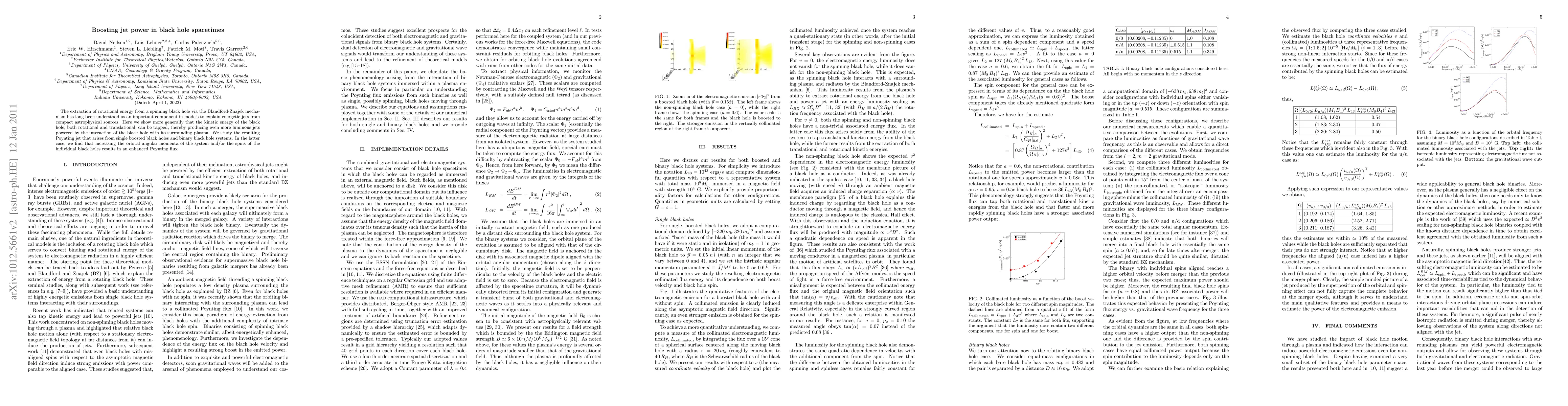 This paper explores the enhancement of jet power in black hole spacetimes by tapping into the black hole's kinetic energy, including both rotational and translational components, leading to more luminous jets. It finds that in binary black hole systems, higher orbital and individual black hole spins boost the Poynting flux, thus increasing jet luminosity.