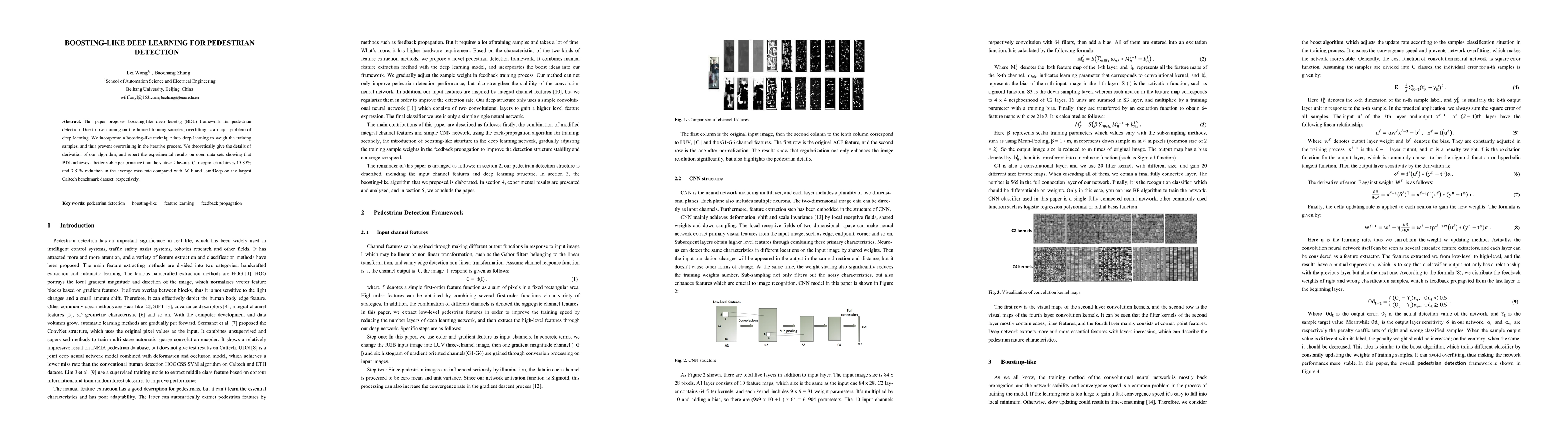 This research introduces a Boosting-like Deep Learning (BDL) framework for pedestrian detection, addressing overfitting in deep learning models by weighting training samples. BDL demonstrates superior performance, reducing miss rates by 15.85% and 3.81% compared to ACF and JointDeep respectively, on the Caltech benchmark dataset.