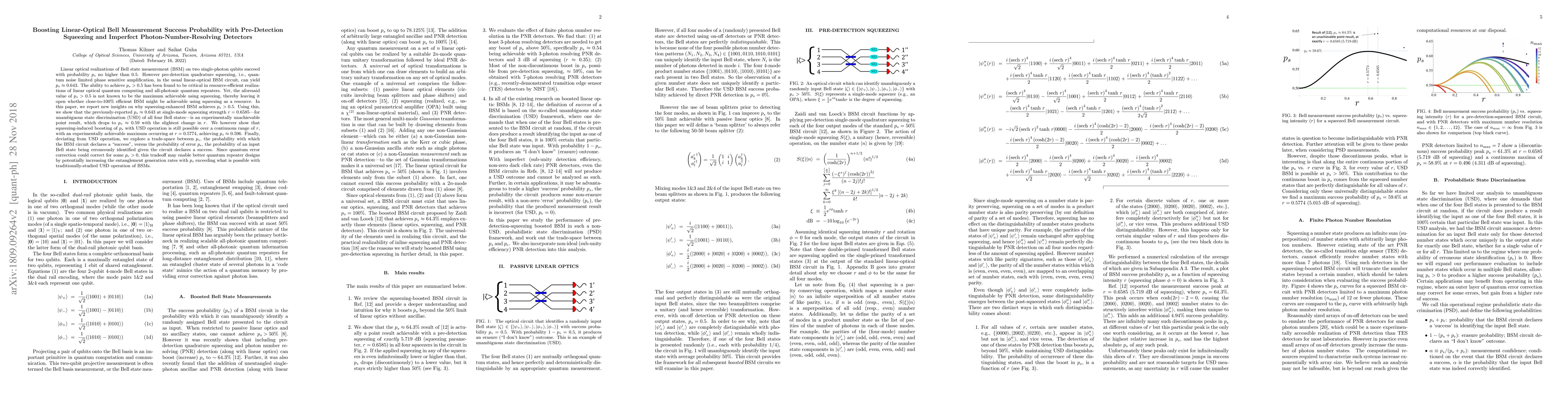 This paper explores how pre-detection squeezing can enhance the success probability ($p_s$) of linear-optical Bell state measurement (BSM) beyond the classical limit of 0.5, achieving up to approximately 0.643. It reveals that this maximum is experimentally unachievable and identifies a more practical maximum at $r=0.5774$ with $p_s \approx 0.596$, while also examining the trade-off between $p_s$ and error probability $p_e$ for improved quantum repeater designs.
