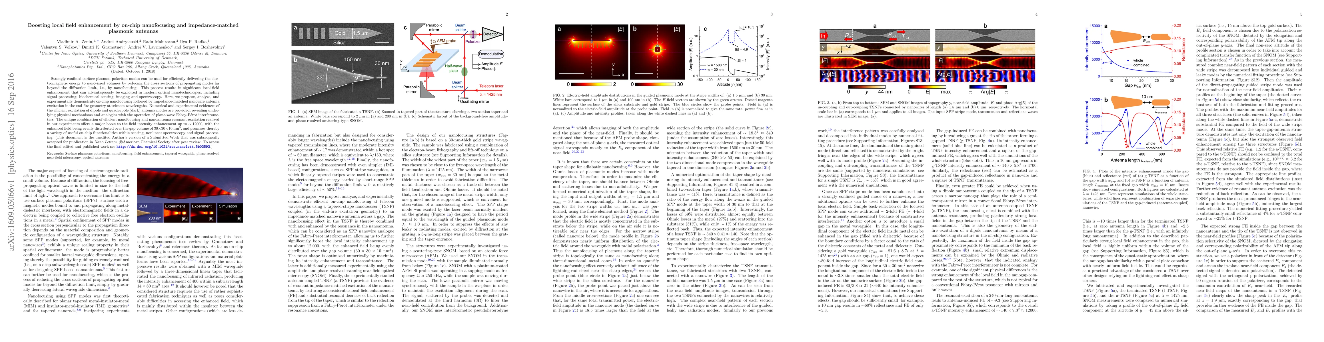 This paper proposes and demonstrates on-chip nanofocusing and impedance-matched plasmonic antennas to achieve significant local field enhancement, boosting field intensity up to 12,000 times, which is useful for applications in sensing, spectroscopy, and signal processing. The study combines numerical and experimental evidence to reveal the physical mechanisms behind efficient dipole and quadrupole modes excitation.