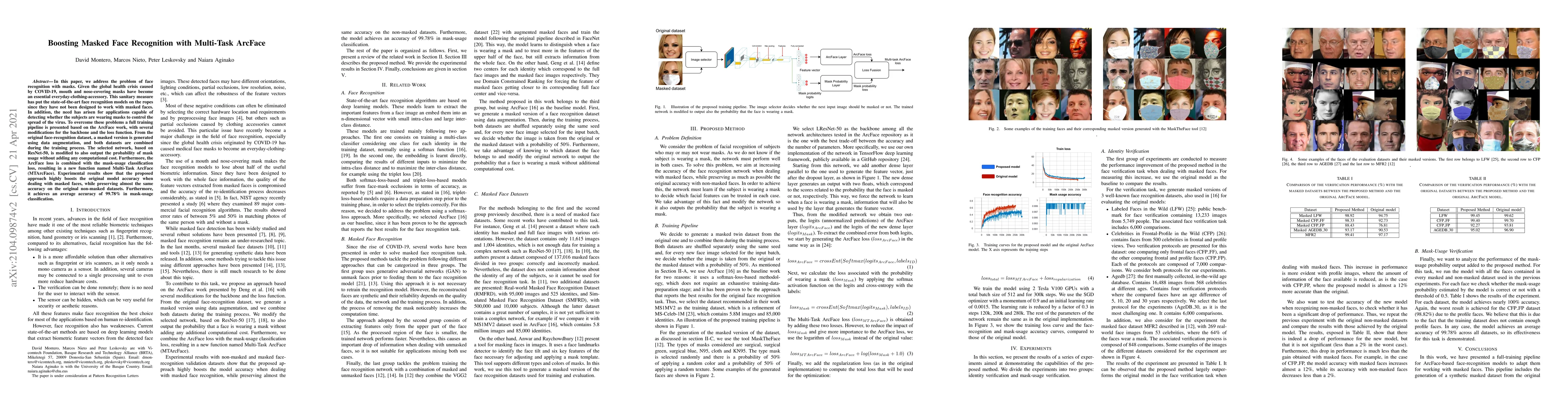 A new face recognition model, Multi-Task ArcFace, improves accuracy on masked faces to 99.78% while preserving performance on non-masked datasets.