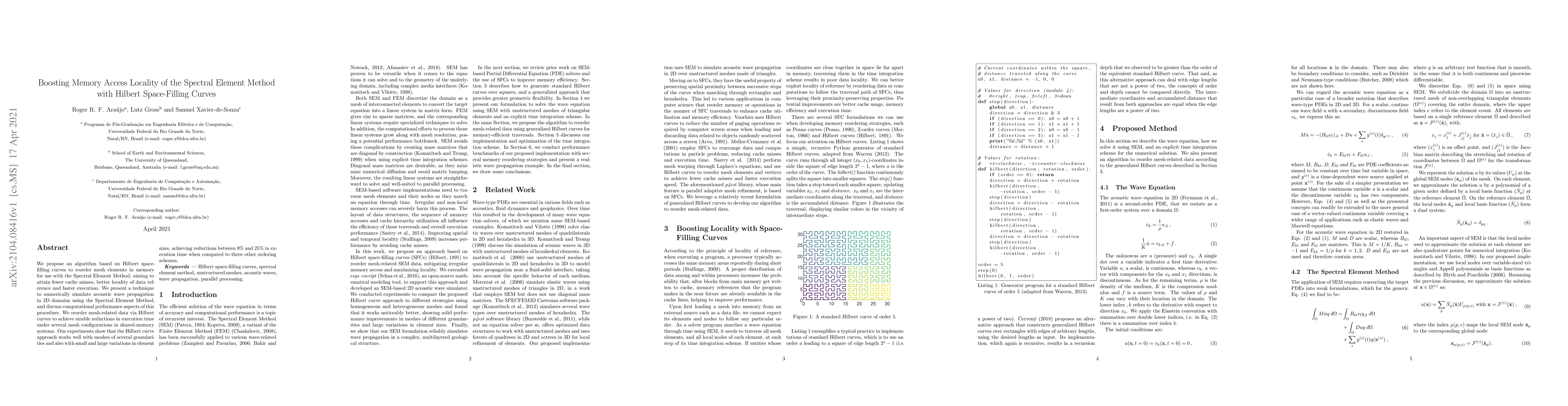 We propose an algorithm based on Hilbert space-filling curves to reorder mesh elements in memory for use with the Spectral Element Method, aiming to attain fewer cache misses, better locality of data reference and faster execution. We present a technique to numerically simulate acoustic wave propagation in 2D domains using the Spectral Element Method, and discuss computational performance aspects of this procedure. We reorder mesh-related data via Hilbert curves to achieve sizable reductions in execution time under several mesh configurations in shared-memory systems. Our experiments show that the Hilbert curve approach works well with meshes of several granularities and also with small and large variations in element sizes, achieving reductions between 9% and 25% in execution time when compared to three other ordering schemes.