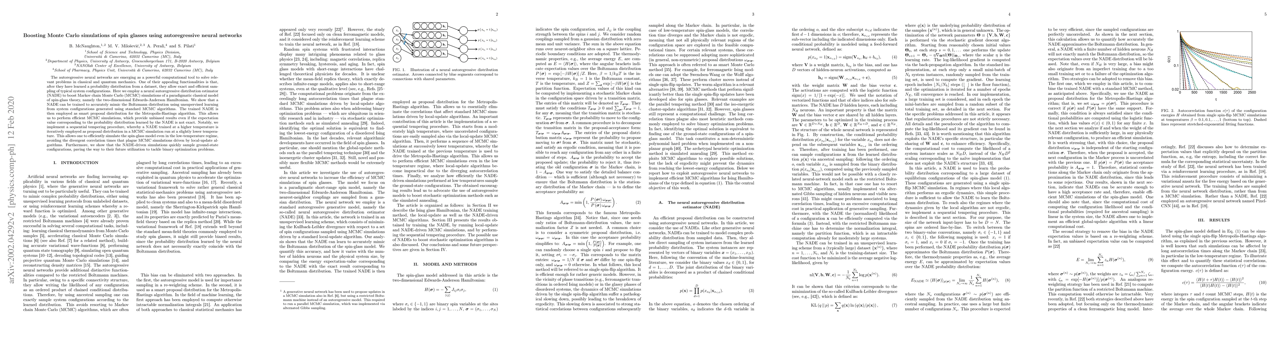 This paper uses autoregressive neural networks to enhance Monte Carlo simulations of spin glasses, specifically the two-dimensional Edwards-Anderson model. The neural autoregressive distribution estimator (NADE) is trained to mimic the Boltzmann distribution, serving as a smart proposal distribution in the Metropolis-Hastings algorithm, improving efficiency and enabling simulations even in low-temperature regimes.