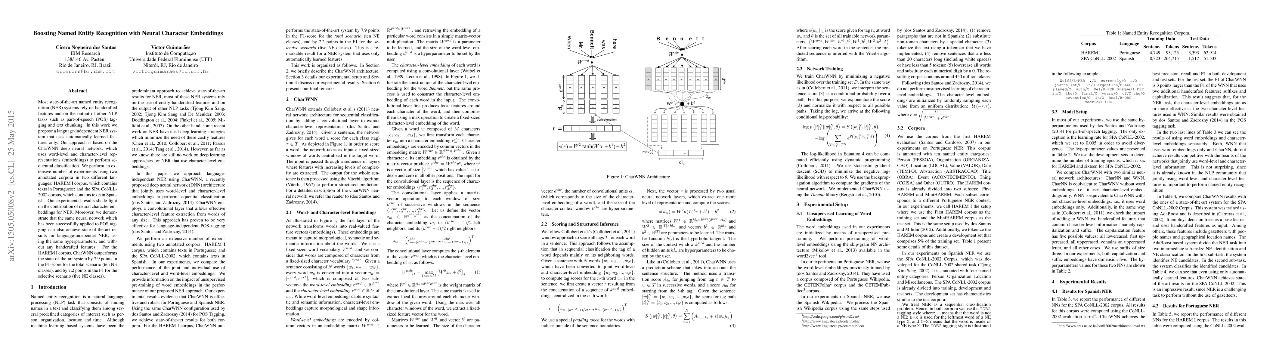 This paper proposes a language-independent named entity recognition (NER) system using CharWNN, which leverages neural character embeddings instead of handcrafted features. Experiments on Portuguese and Spanish corpora show significant improvements over the state-of-the-art, highlighting the effectiveness of character-level representations for NER.