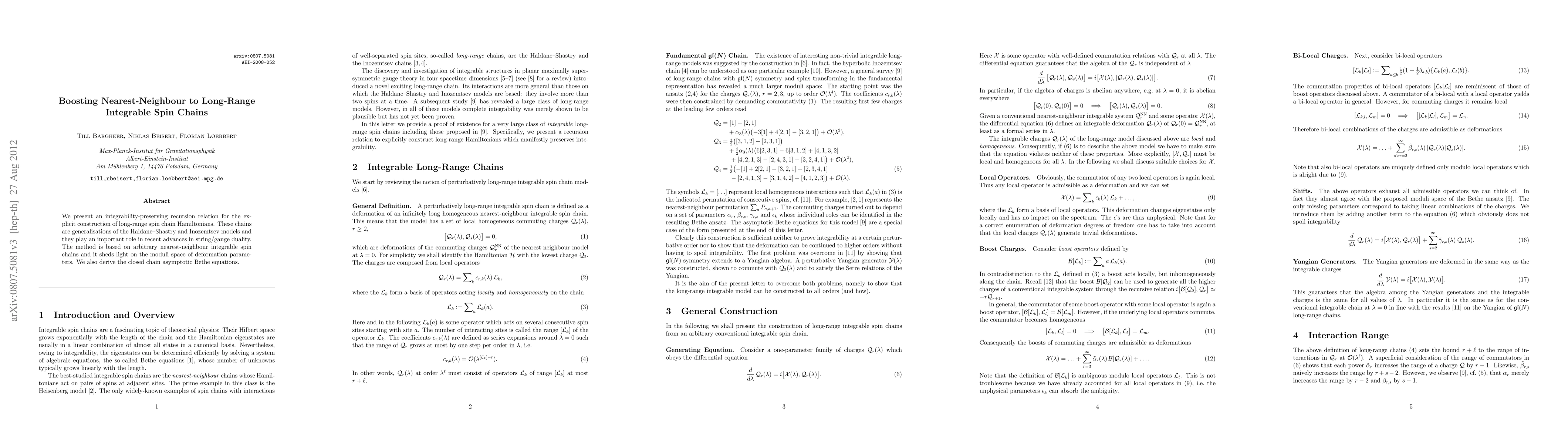 We present an integrability-preserving recursion relation for the explicit construction of long-range spin chain Hamiltonians. These chains are generalizations of the Haldane-Shastry and Inozemtsev models and they play an important role in recent advances in string/gauge duality. The method is based on arbitrary nearest-neighbour integrable spin chains and it sheds light on the moduli space of deformation parameters. We also derive the closed chain asymptotic Bethe equations.