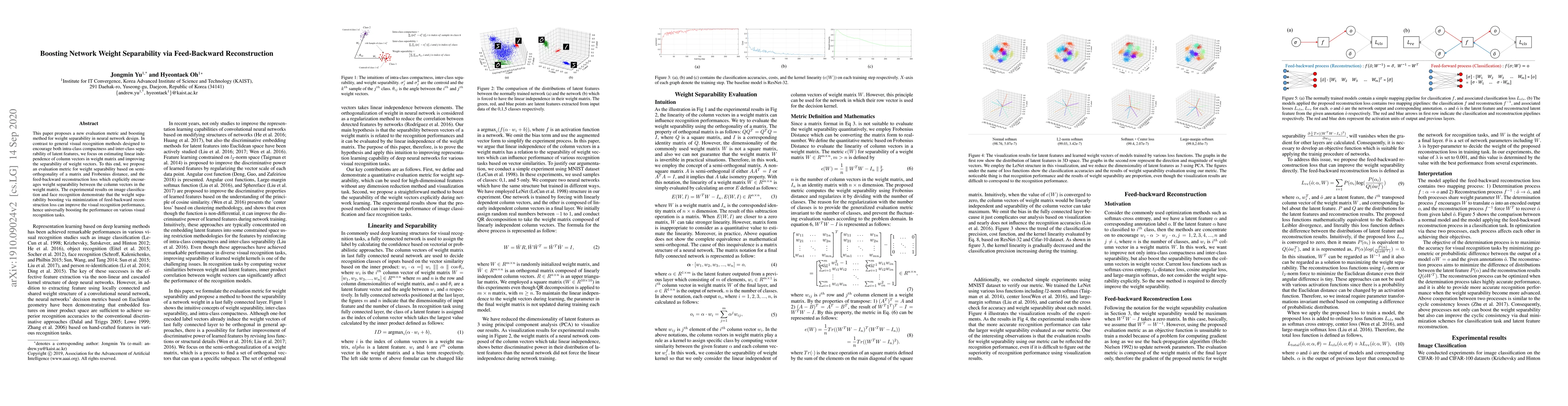 This paper introduces a new metric and boosting method to enhance weight separability in neural networks, focusing on the linear independence of weight matrix columns. It employs a semi-orthogonality-based evaluation metric and a feed-backward reconstruction loss, showing improved visual recognition performance in image classification and face recognition tasks.