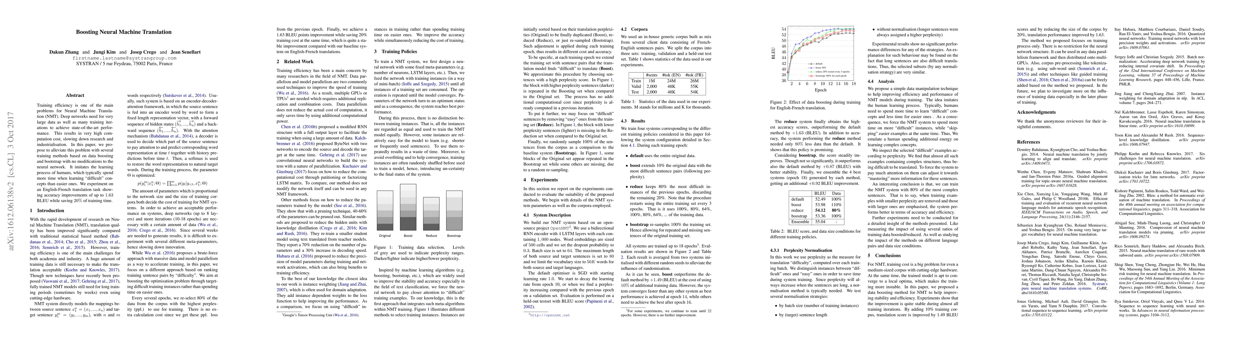 Training efficiency is one of the main problems for Neural Machine Translation (NMT). Deep networks need for very large data as well as many training iterations to achieve state-of-the-art performance. This results in very high computation cost, slowing down research and industrialisation. In this paper, we propose to alleviate this problem with several training methods based on data boosting and bootstrap with no modifications to the neural network. It imitates the learning process of humans, which typically spend more time when learning "difficult" concepts than easier ones. We experiment on an English-French translation task showing accuracy improvements of up to 1.63 BLEU while saving 20% of training time.