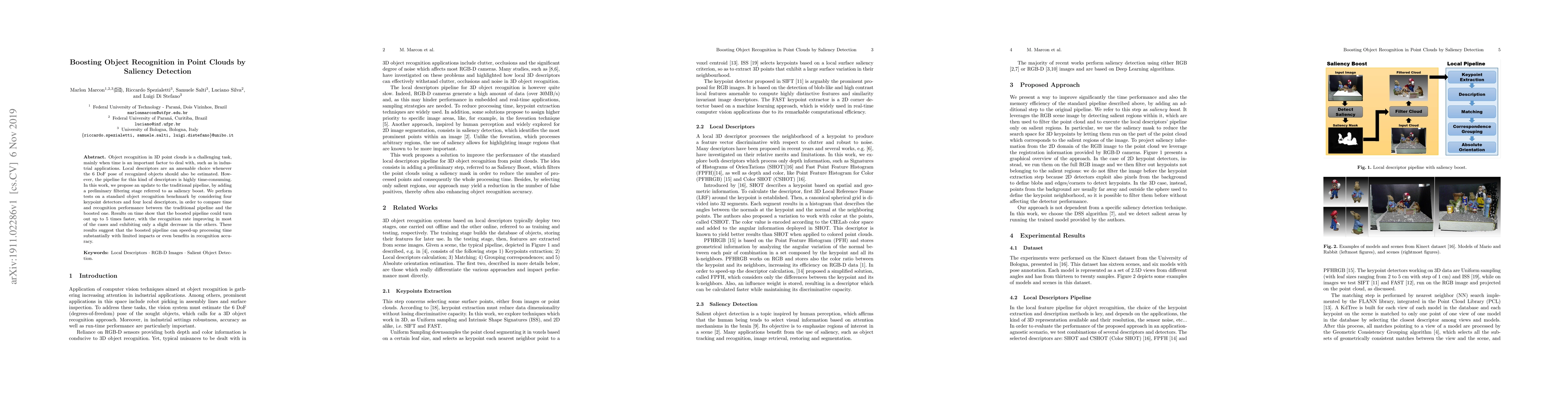 Object recognition in 3D point clouds is a challenging task, mainly when time is an important factor to deal with, such as in industrial applications. Local descriptors are an amenable choice whenever the 6 DoF pose of recognized objects should also be estimated. However, the pipeline for this kind of descriptors is highly time-consuming. In this work, we propose an update to the traditional pipeline, by adding a preliminary filtering stage referred to as saliency boost. We perform tests on a standard object recognition benchmark by considering four keypoint detectors and four local descriptors, in order to compare time and recognition performance between the traditional pipeline and the boosted one. Results on time show that the boosted pipeline could turn out up to 5 times faster, with the recognition rate improving in most of the cases and exhibiting only a slight decrease in the others. These results suggest that the boosted pipeline can speed-up processing time substantially with limited impacts or even benefits in recognition accuracy.