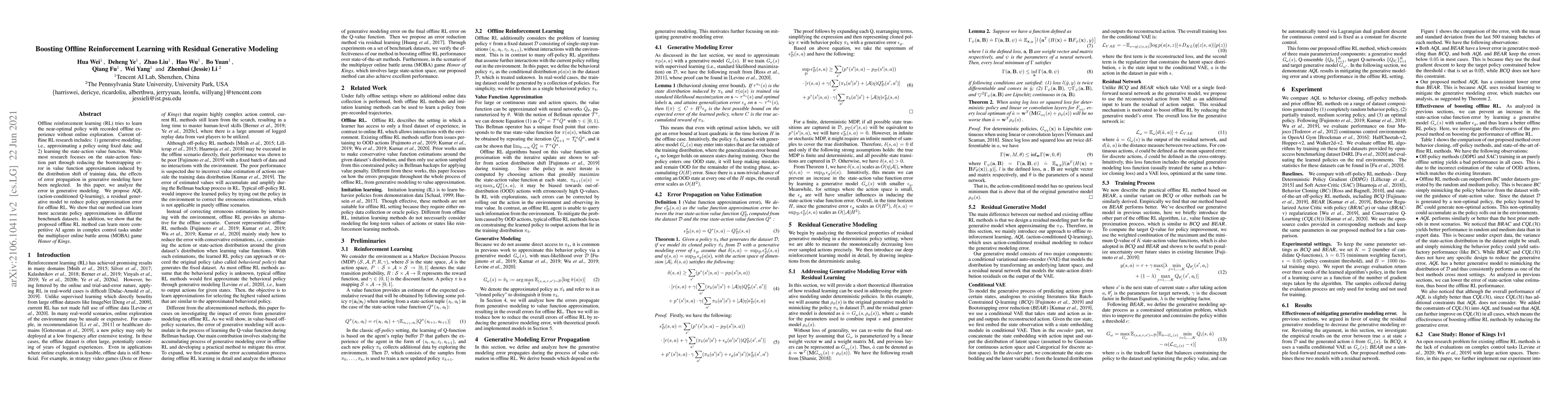This paper proposes AQL, a residual generative model for offline reinforcement learning that reduces policy approximation error by addressing error propagation in generative modeling. The method demonstrates improved policy accuracy across benchmark datasets and competitive performance in complex control tasks in the MOBA game Honor of Kings.