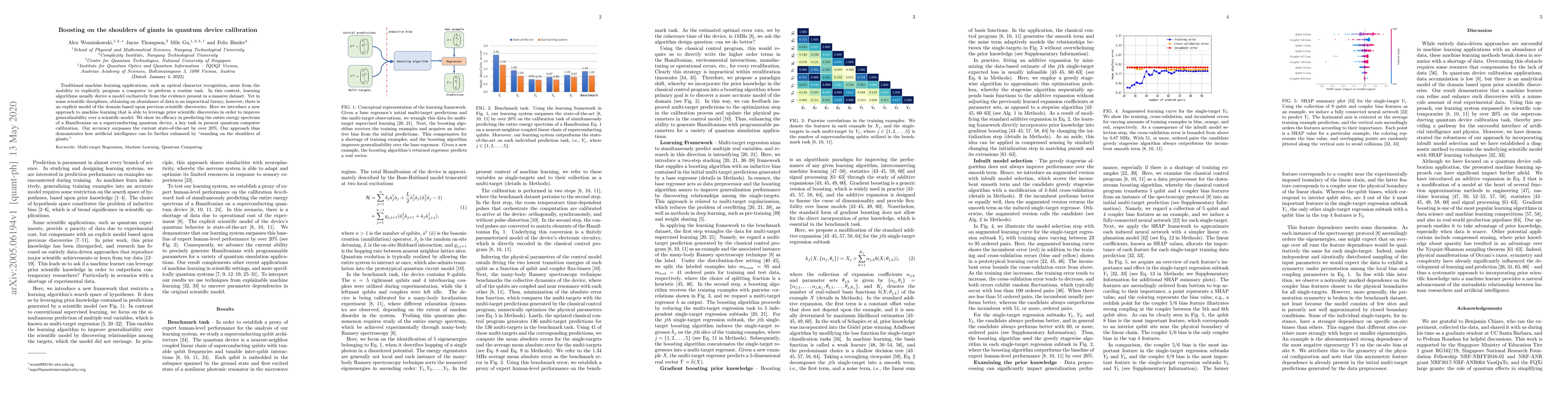 Traditional machine learning applications, such as optical character recognition, arose from the inability to explicitly program a computer to perform a routine task. In this context, learning algorithms usually derive a model exclusively from the evidence present in a massive dataset. Yet in some scientific disciplines, obtaining an abundance of data is an impractical luxury, however; there is an explicit model of the domain based upon previous scientific discoveries. Here we introduce a new approach to machine learning that is able to leverage prior scientific discoveries in order to improve generalizability over a scientific model. We show its efficacy in predicting the entire energy spectrum of a Hamiltonian on a superconducting quantum device, a key task in present quantum computer calibration. Our accuracy surpasses the current state-of-the-art by over $20\%.$ Our approach thus demonstrates how artificial intelligence can be further enhanced by "standing on the shoulders of giants."