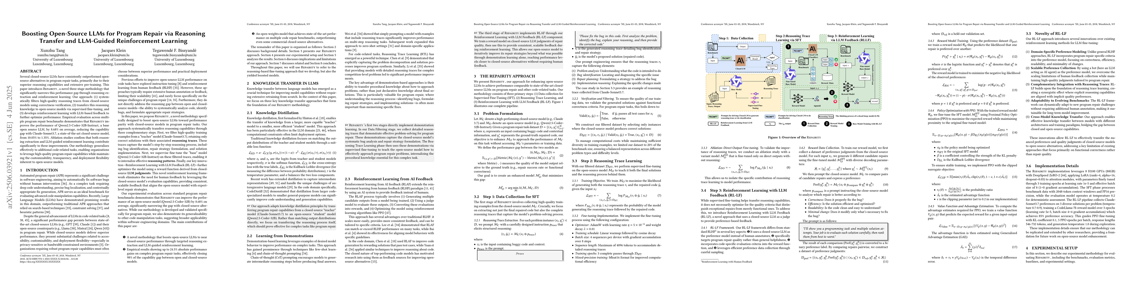 A new method called Repairity boosts open-source language models for program repair through reasoning extraction and reinforcement learning, narrowing the performance gap with closed-source alternatives.