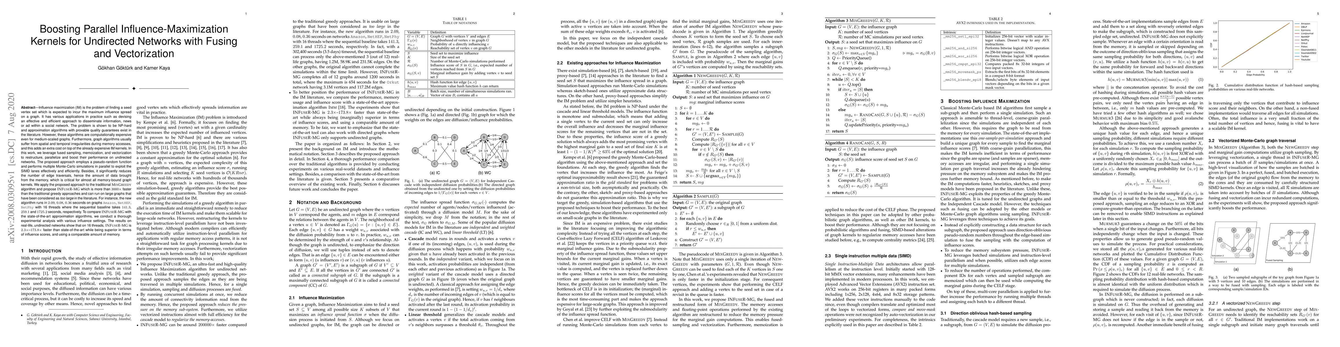 Influence maximization (IM) is the problem of finding a seed vertex set which is expected to incur the maximum influence spread on a graph. It has various applications in practice such as devising an effective and efficient approach to disseminate information, news or ad within a social network. The problem is shown to be NP-hard and approximation algorithms with provable quality guarantees exist in the literature. However, these algorithms are computationally expensive even for medium-scaled graphs. Furthermore, graph algorithms usually suffer from spatial and temporal irregularities during memory accesses, and this adds an extra cost on top of the already expensive IM kernels. In this work, we leverage fused sampling, memoization, and vectorization to restructure, parallelize and boost their performance on undirected networks. The proposed approach employs a pseudo-random function and performs multiple Monte-Carlo simulations in parallel to exploit the SIMD lanes effectively and efficiently. Besides, it significantly reduces the number of edge traversals, hence the amount of data brought from the memory, which is critical for almost all memory-bound graph kernels. We apply the proposed approach to the traditional MixGreedy algorithm and propose Infuser which is more than 3000 times faster than the traditional greedy approaches and can run on large graphs that have been considered as too large in the literature.