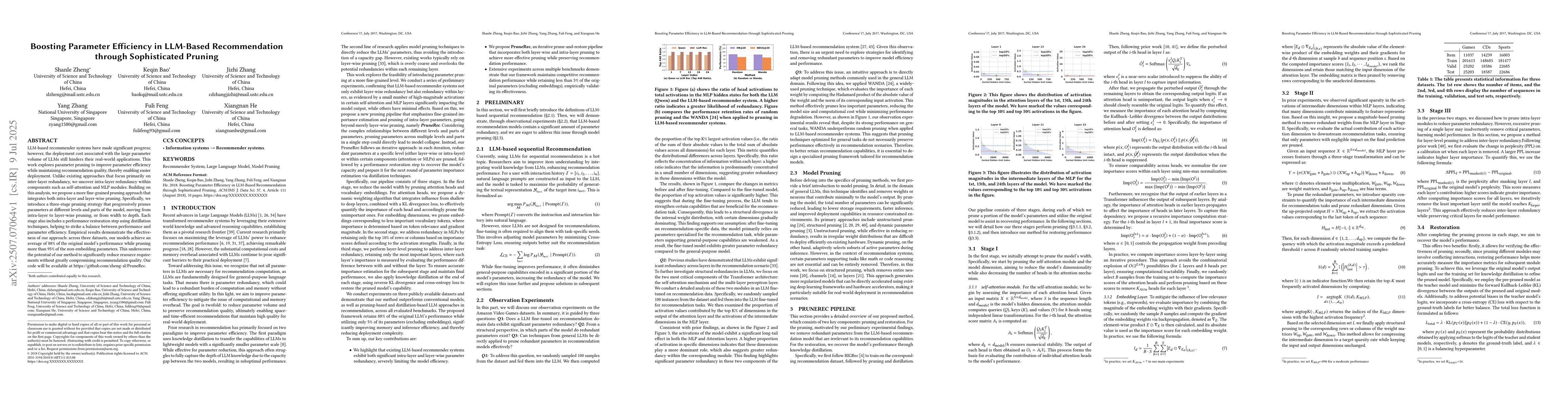 LLM-based recommender systems have made significant progress; however, the deployment cost associated with the large parameter volume of LLMs still hinders their real-world applications. This work explores parameter pruning to improve parameter efficiency while maintaining recommendation quality, thereby enabling easier deployment. Unlike existing approaches that focus primarily on inter-layer redundancy, we uncover intra-layer redundancy within components such as self-attention and MLP modules. Building on this analysis, we propose a more fine-grained pruning approach that integrates both intra-layer and layer-wise pruning. Specifically, we introduce a three-stage pruning strategy that progressively prunes parameters at different levels and parts of the model, moving from intra-layer to layer-wise pruning, or from width to depth. Each stage also includes a performance restoration step using distillation techniques, helping to strike a balance between performance and parameter efficiency. Empirical results demonstrate the effectiveness of our approach: across three datasets, our models achieve an average of 88% of the original model's performance while pruning more than 95% of the non-embedding parameters. This underscores the potential of our method to significantly reduce resource requirements without greatly compromising recommendation quality. Our code will be available at: https://github.com/zheng-sl/PruneRec