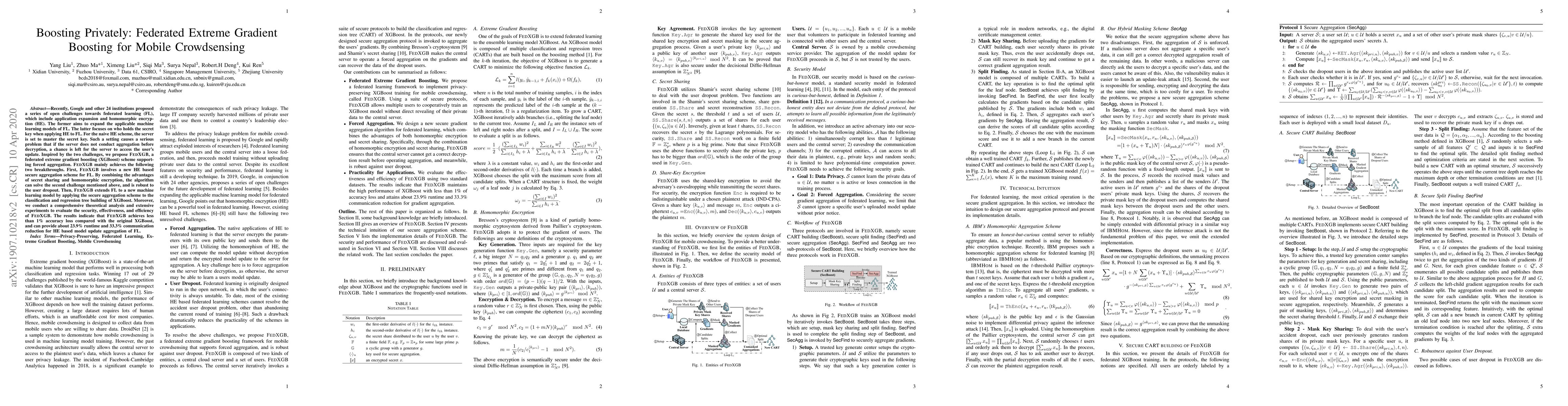 This paper proposes FedXGB, a privacy-preserving federated extreme gradient boosting scheme for mobile crowdsensing, addressing challenges in federated learning's application expansion and homomorphic encryption. FedXGB introduces a novel secure aggregation scheme combining secret sharing and homomorphic encryption, achieving robust performance even with user dropout.