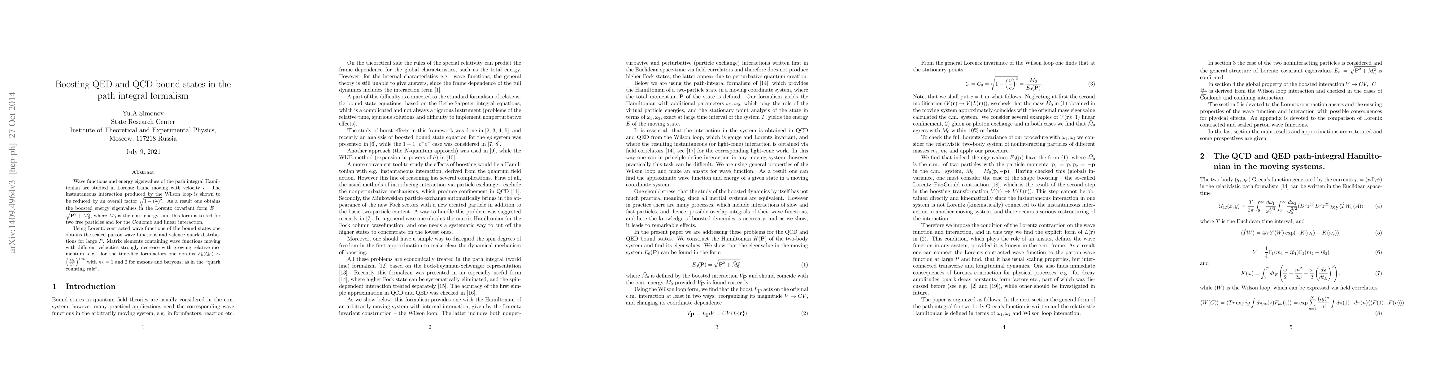 Wave functions and energy eigenvalues of the path integral Hamiltonian are studied in Lorentz frame moving with velocity $v$. The instantaneous interaction produced by the Wilson loop is shown to be reduced by an overall factor $\sqrt{1-(\frac{v}{c})^2}$. As a result one obtains the boosted energy eigenvalues in the Lorentz covariant form $E= \sqrt{\veP^2+M^2_0}$, where $M_0$ is the c.m. energy, and this form is tested for two free particles and for the Coulomb and linear interaction.Using Lorentz contracted wave functions of the bound states one obtains the scaled parton wave functions and valence quark distributions for large $P$. Matrix elements containing wave functions moving with different velocities strongly decrease with growing relative momentum, e.g. for the time-like formfactors one obtains $F_h(Q_0)\sim (\frac{M_h}{Q_0})^{2 n_h} $ with $n_h = 1$ and 2 for mesons and baryons, as in the "quark counting rule".