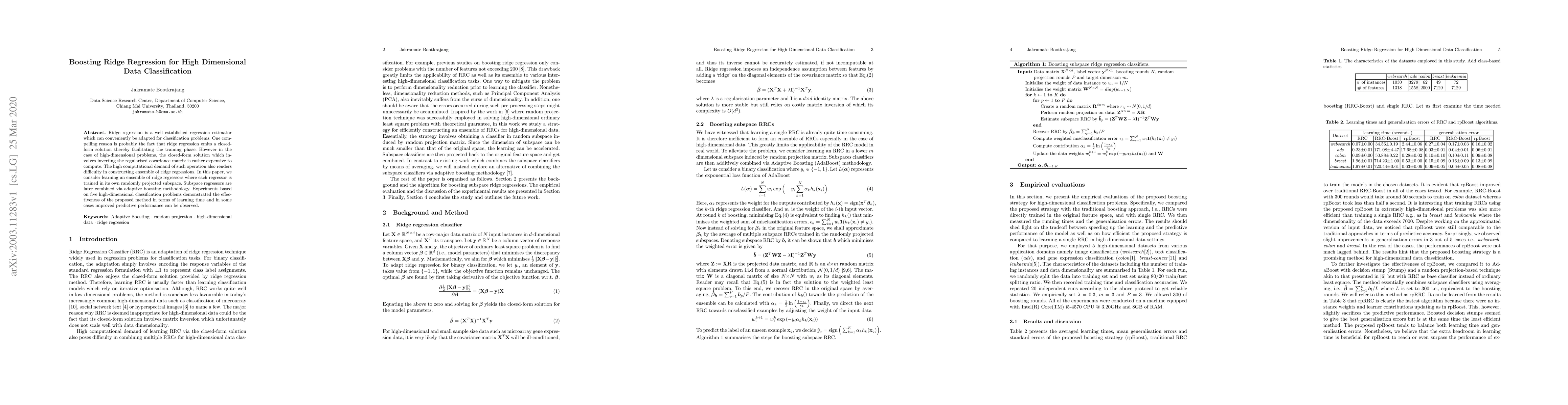 This paper proposes an ensemble method for high-dimensional classification using adaptive boosting of ridge regression models trained in randomly projected subspaces, significantly reducing computational costs and improving learning time. Experimental results show improved performance on several high-dimensional datasets.