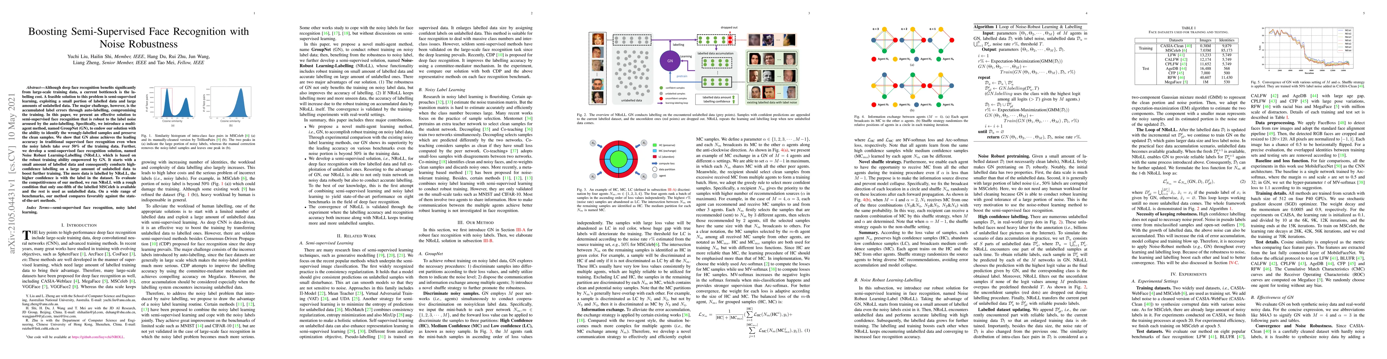 Although deep face recognition benefits significantly from large-scale training data, a current bottleneck is the labelling cost. A feasible solution to this problem is semi-supervised learning, exploiting a small portion of labelled data and large amounts of unlabelled data. The major challenge, however, is the accumulated label errors through auto-labelling, compromising the training. This paper presents an effective solution to semi-supervised face recognition that is robust to the label noise aroused by the auto-labelling. Specifically, we introduce a multi-agent method, named GroupNet (GN), to endow our solution with the ability to identify the wrongly labelled samples and preserve the clean samples. We show that GN alone achieves the leading accuracy in traditional supervised face recognition even when the noisy labels take over 50\% of the training data. Further, we develop a semi-supervised face recognition solution, named Noise Robust Learning-Labelling (NRoLL), which is based on the robust training ability empowered by GN. It starts with a small amount of labelled data and consequently conducts high-confidence labelling on a large amount of unlabelled data to boost further training. The more data is labelled by NRoLL, the higher confidence is with the label in the dataset. To evaluate the competitiveness of our method, we run NRoLL with a rough condition that only one-fifth of the labelled MSCeleb is available and the rest is used as unlabelled data. On a wide range of benchmarks, our method compares favorably against the state-of-the-art methods.