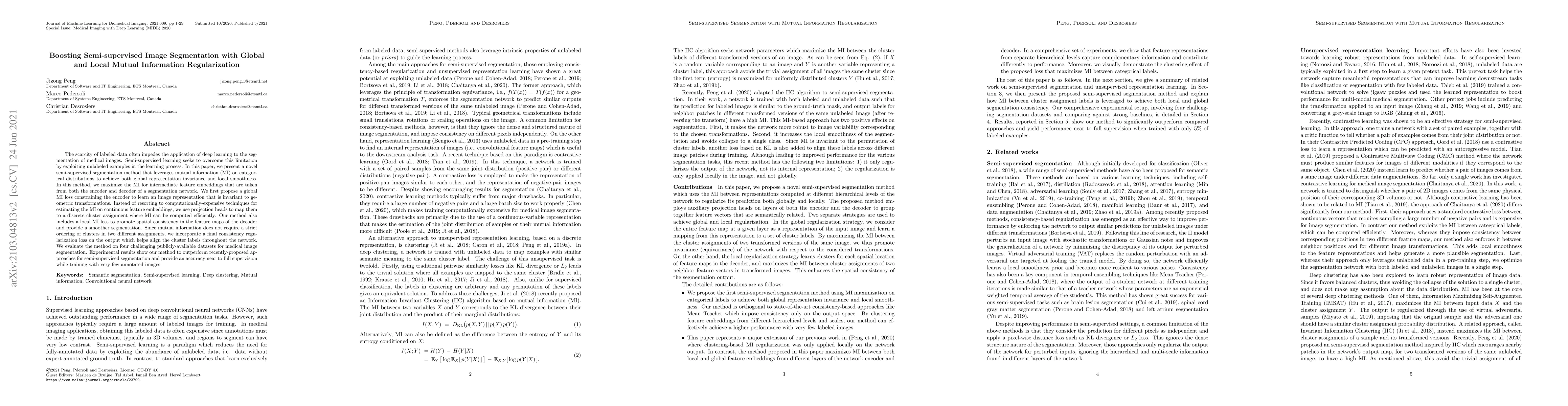 This paper introduces a semi-supervised segmentation method that utilizes mutual information for both global invariance and local smoothness in medical image segmentation. The approach leverages global and local MI losses, along with consistency regularization, to achieve superior performance with minimal labeled data.