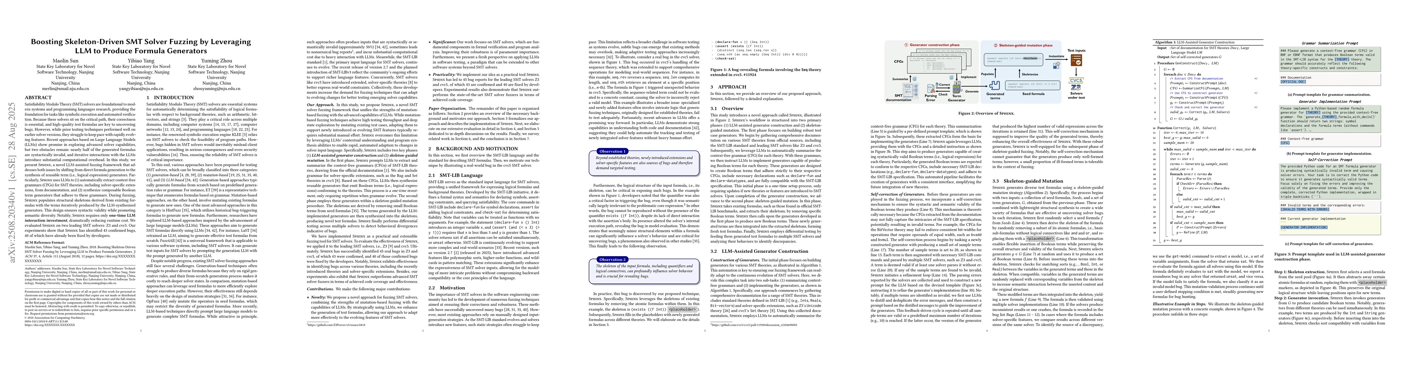 Satisfiability Modulo Theory (SMT) solvers are foundational to modern systems and programming languages research, providing the foundation for tasks like symbolic execution and automated verification. Because these solvers sit on the critical path, their correctness is essential, and high-quality test formulas are key to uncovering bugs. However, while prior testing techniques performed well on earlier solver versions, they struggle to keep pace with rapidly evolving features. Recent approaches based on Large Language Models (LLMs) show promise in exploring advanced solver capabilities, but two obstacles remain: nearly half of the generated formulas are syntactically invalid, and iterative interactions with the LLMs introduce substantial computational overhead. In this study, we present Chimera, a novel LLM-assisted fuzzing framework that addresses both issues by shifting from direct formula generation to the synthesis of reusable term (i.e., logical expression) generators. Particularly, Chimera uses LLMs to (1) automatically extract context-free grammars (CFGs) for SMT theories, including solver-specific extensions, from documentation, and (2) synthesize composable Boolean term generators that adhere to these grammars. During fuzzing, Chimera populates structural skeletons derived from existing formulas with the terms iteratively produced by the LLM-synthesized generators. This design ensures syntactic validity while promoting semantic diversity. Notably, Chimera requires only one-time LLM interaction investment, dramatically reducing runtime cost. We evaluated Chimera on two leading SMT solvers: Z3 and cvc5. Our experiments show that Chimera has identified 43 confirmed bugs, 40 of which have already been fixed by developers.