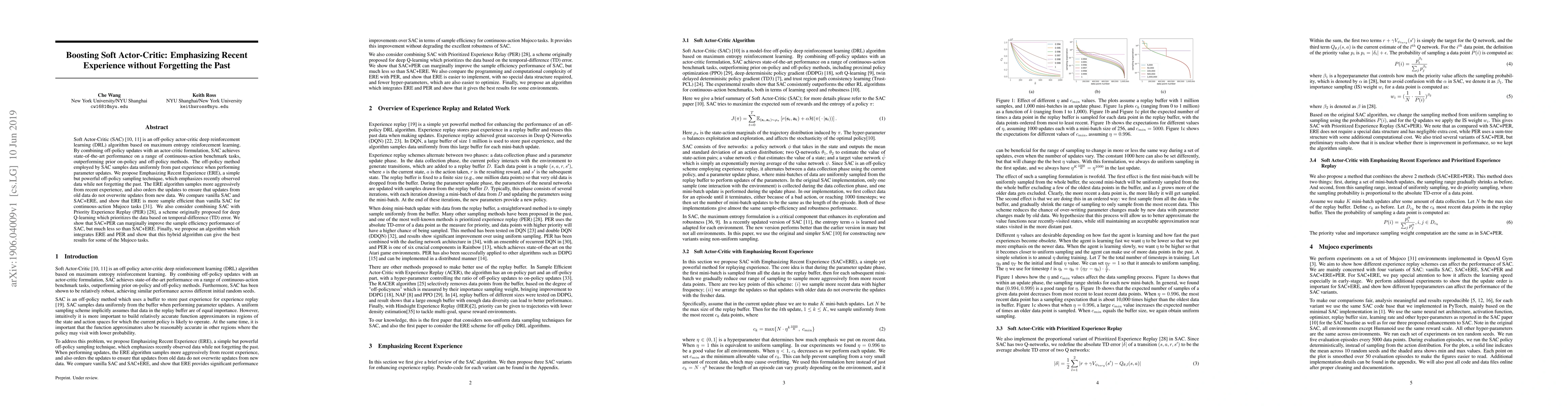 A new algorithm called Emphasizing Recent Experience (ERE) improves upon Soft Actor-Critic by giving more weight to recent experience while still considering past data, leading to better performance on continuous-action tasks.