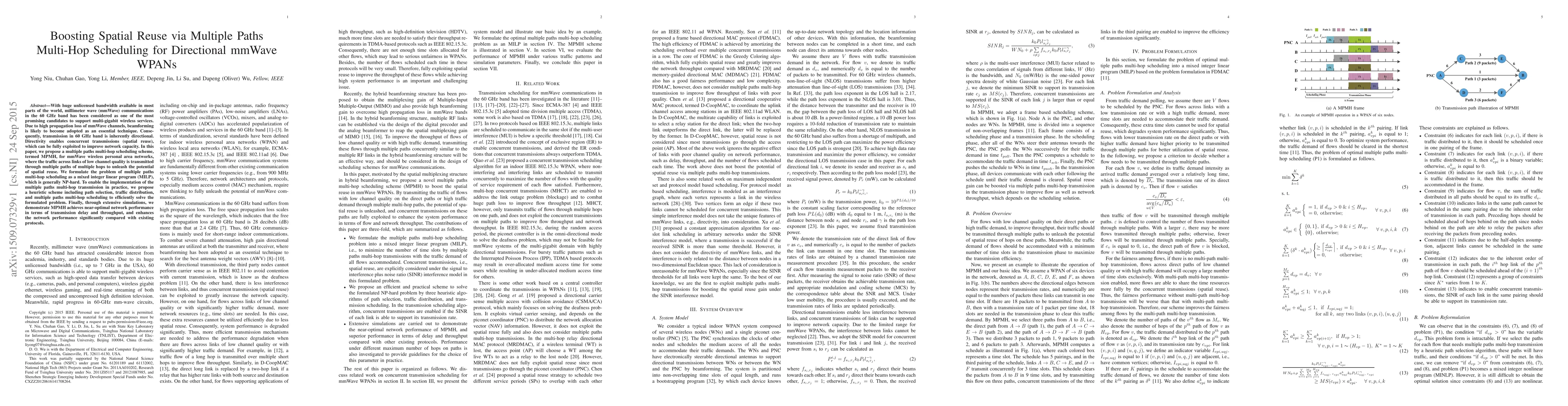 This paper proposes a multiple paths multi-hop scheduling scheme, MPMH, for directional mmWave WPANs to enhance spatial reuse and network capacity. It employs a heuristic approach to solve the NP-hard problem of scheduling, demonstrating near-optimal performance in delay and throughput through simulations.