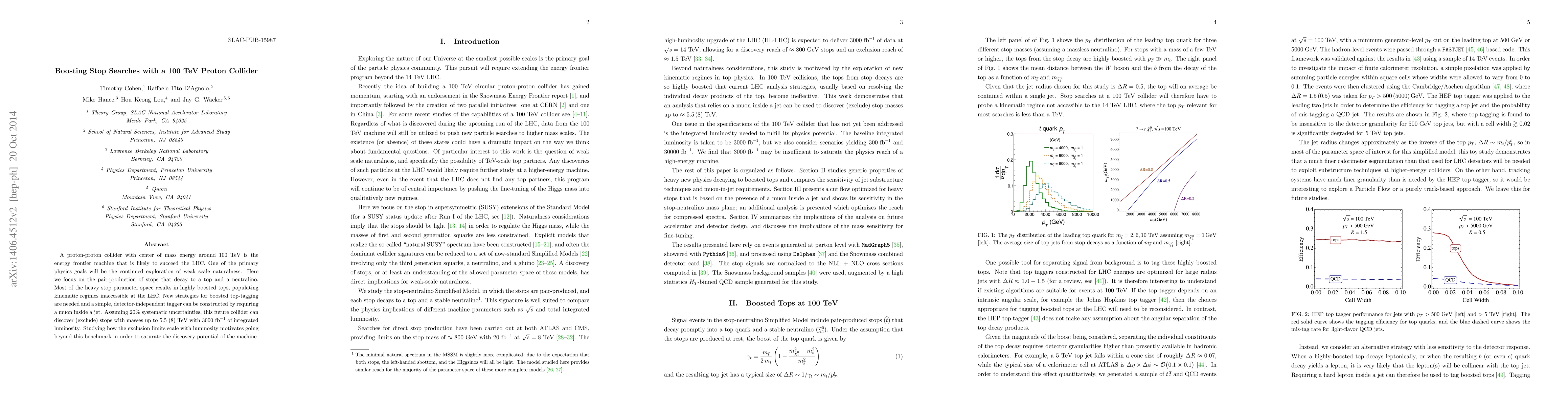 A proton-proton collider with center of mass energy around 100 TeV is the energy frontier machine that is likely to succeed the LHC. One of the primary physics goals will be the continued exploration of weak scale naturalness. Here we focus on the pair-production of stops that decay to a top and a neutralino. Most of the heavy stop parameter space results in highly boosted tops, populating kinematic regimes inaccessible at the LHC. New strategies for boosted top-tagging are needed and a simple, detector-independent tagger can be constructed by requiring a muon inside a jet. Assuming 20% systematic uncertainties, this future collider can discover (exclude) stops with masses up to 6.5 (8) TeV with 3000 fb^-1 of integrated luminosity. Studying how the exclusion limits scale with luminosity motivates going beyond this benchmark in order to saturate the discovery potential of the machine.
