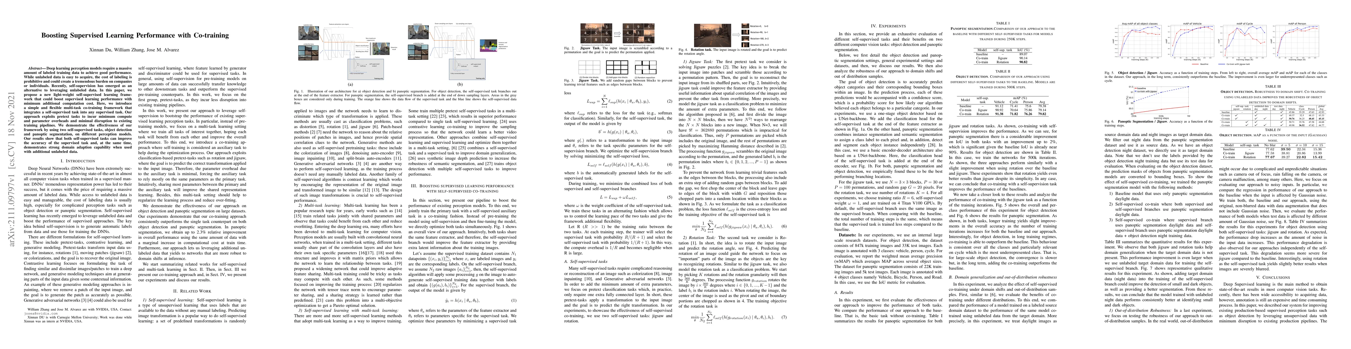 Deep learning perception models require a massive amount of labeled training data to achieve good performance. While unlabeled data is easy to acquire, the cost of labeling is prohibitive and could create a tremendous burden on companies or individuals. Recently, self-supervision has emerged as an alternative to leveraging unlabeled data. In this paper, we propose a new light-weight self-supervised learning framework that could boost supervised learning performance with minimum additional computation cost. Here, we introduce a simple and flexible multi-task co-training framework that integrates a self-supervised task into any supervised task. Our approach exploits pretext tasks to incur minimum compute and parameter overheads and minimal disruption to existing training pipelines. We demonstrate the effectiveness of our framework by using two self-supervised tasks, object detection and panoptic segmentation, on different perception models. Our results show that both self-supervised tasks can improve the accuracy of the supervised task and, at the same time, demonstrates strong domain adaption capability when used with additional unlabeled data.