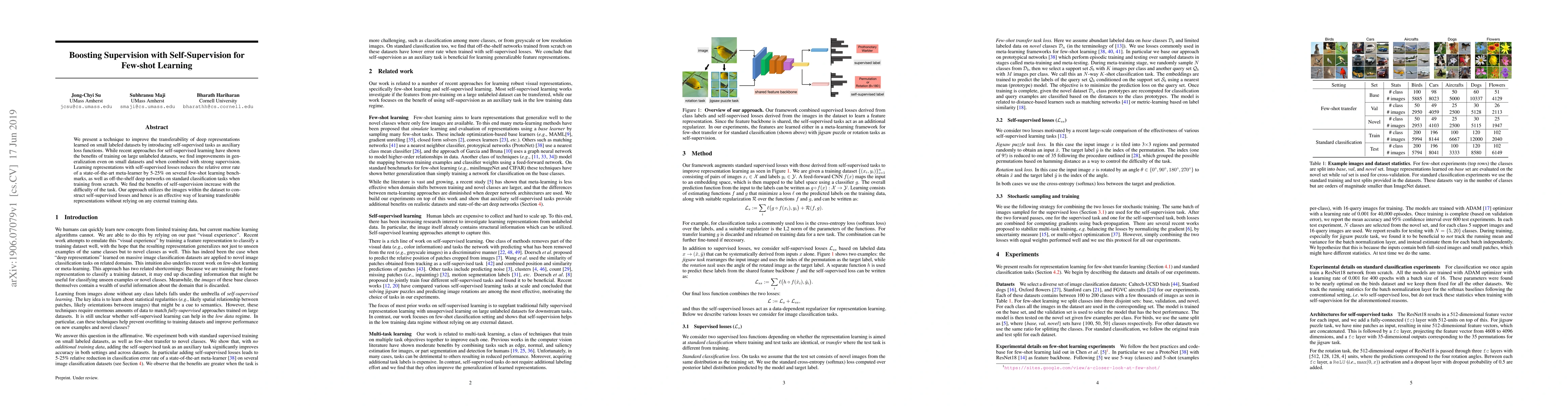 We present a technique to improve the transferability of deep representations learned on small labeled datasets by introducing self-supervised tasks as auxiliary loss functions. While recent approaches for self-supervised learning have shown the benefits of training on large unlabeled datasets, we find improvements in generalization even on small datasets and when combined with strong supervision. Learning representations with self-supervised losses reduces the relative error rate of a state-of-the-art meta-learner by 5-25% on several few-shot learning benchmarks, as well as off-the-shelf deep networks on standard classification tasks when training from scratch. We find the benefits of self-supervision increase with the difficulty of the task. Our approach utilizes the images within the dataset to construct self-supervised losses and hence is an effective way of learning transferable representations without relying on any external training data.